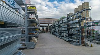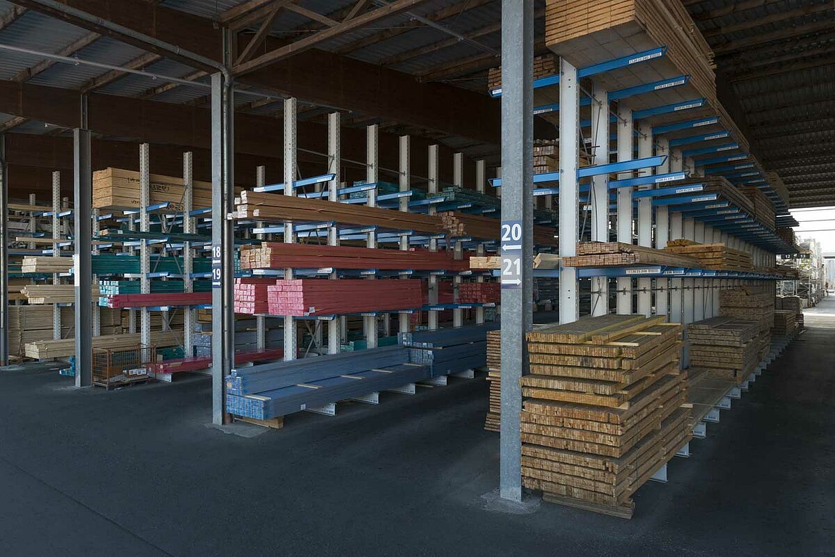 Além disso, o armazém existente deveria ser otimizado: Não se trata apenas do fornecimento aos clientes, mas a partir daqui, as outras quatro sucursais serão também fornecidas com madeira e materiais de construção. Como parte da reestruturação, a Beinbrech decidiu substituir os sistemas de prateleiras existentes por novas estantes cantilever. São significativamente mais elevadas do que as antigas estantes com uma altura de estante de até 6,58 metros e, assim, oferecem mais espaço. Assim, é possível satisfazer rapidamente todos os pedidos de última hora e armazenar grandes quantidades.