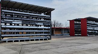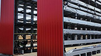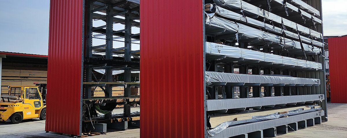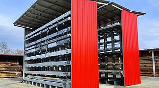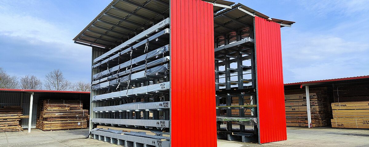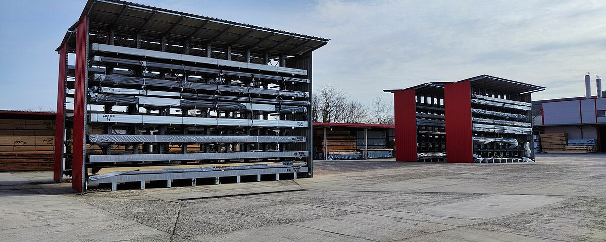 No passado, a Borovi armazenava a sua madeira empilhada sob toldos. No entanto, o armazenamento no chão ocupa muito espaço e o acesso a artigos individuais exigia repetidas transferências de stock, o que demorava muito tempo. Por isso, o comerciante de madeira decidiu criar a nova capacidade de armazenamento utilizando estantes cantiléver. Para proteger a madeira das intempéries, as estantes foram equipadas com um teto de 2,7 metros de profundidade em ambos os lados. Na parte da frente das estantes, foram montadas molduras de exposição que suportam uma chapa trapezoidal revestida a pó como parede lateral. Além disso, os suportes das estantes estão equipados com perfis em U nos quais podem ser inseridas placas. As estacas-pranchas resultantes protegem adicionalmente a madeira da precipitação. Este método de construção poupou à Borovi a construção demorada e dispendiosa de um novo armazém.