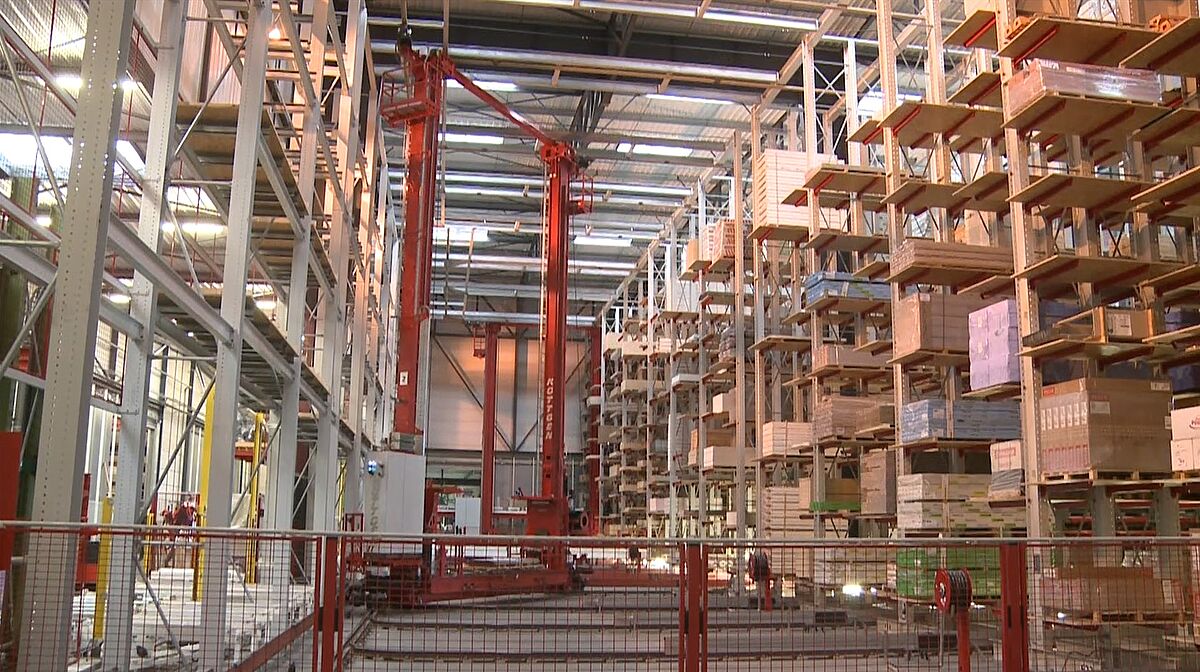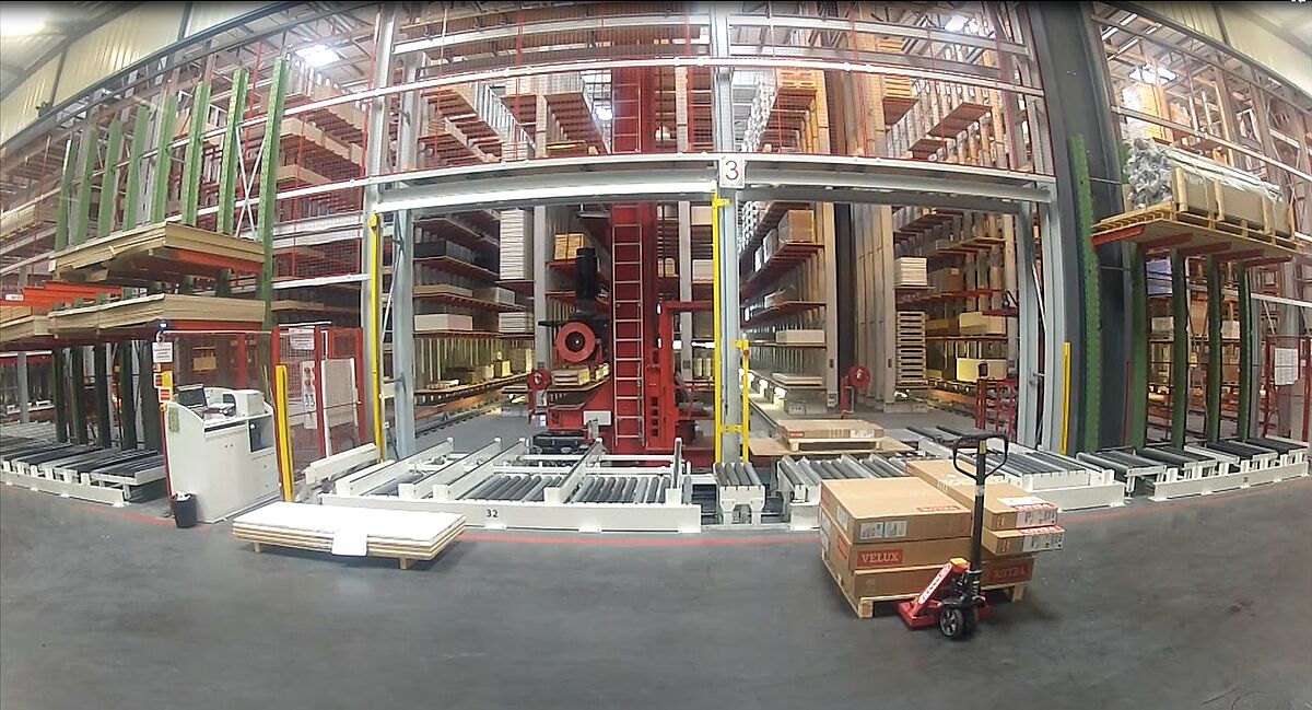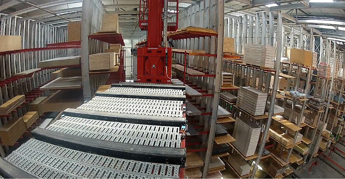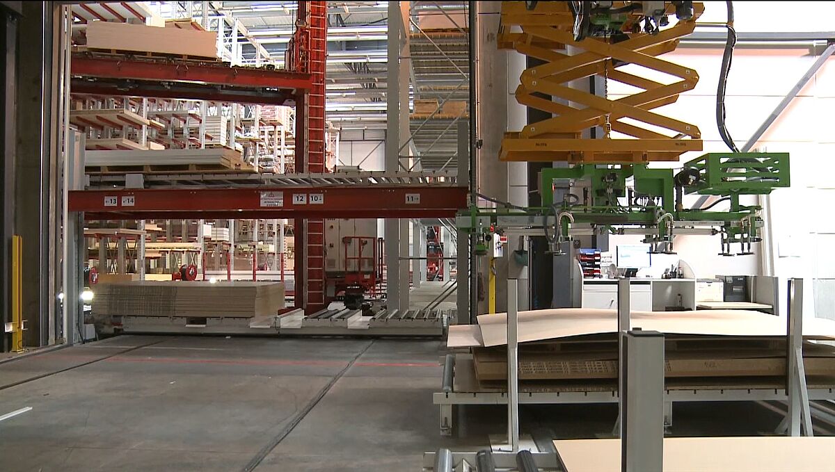 Na zona 1 um transtocador completamente automático encarrega-se da entrada e saída dos pacotes de painéis aglomerados ou das peças de laminados em paletes de até 5,1 metros de comprimento e até 5 toneladas de peso. O transtocador adaptado para curvas serve os três corredores deste sector do depósito. A mercadoria é retirada para os pedidos dos clientes ou para pedidos de fabricação do sector de corte próprio. Os transportadores de cadeia ou de rolos recolhem as mercadorias do transtocador e as transportam até as respectivas estações de trabalho.