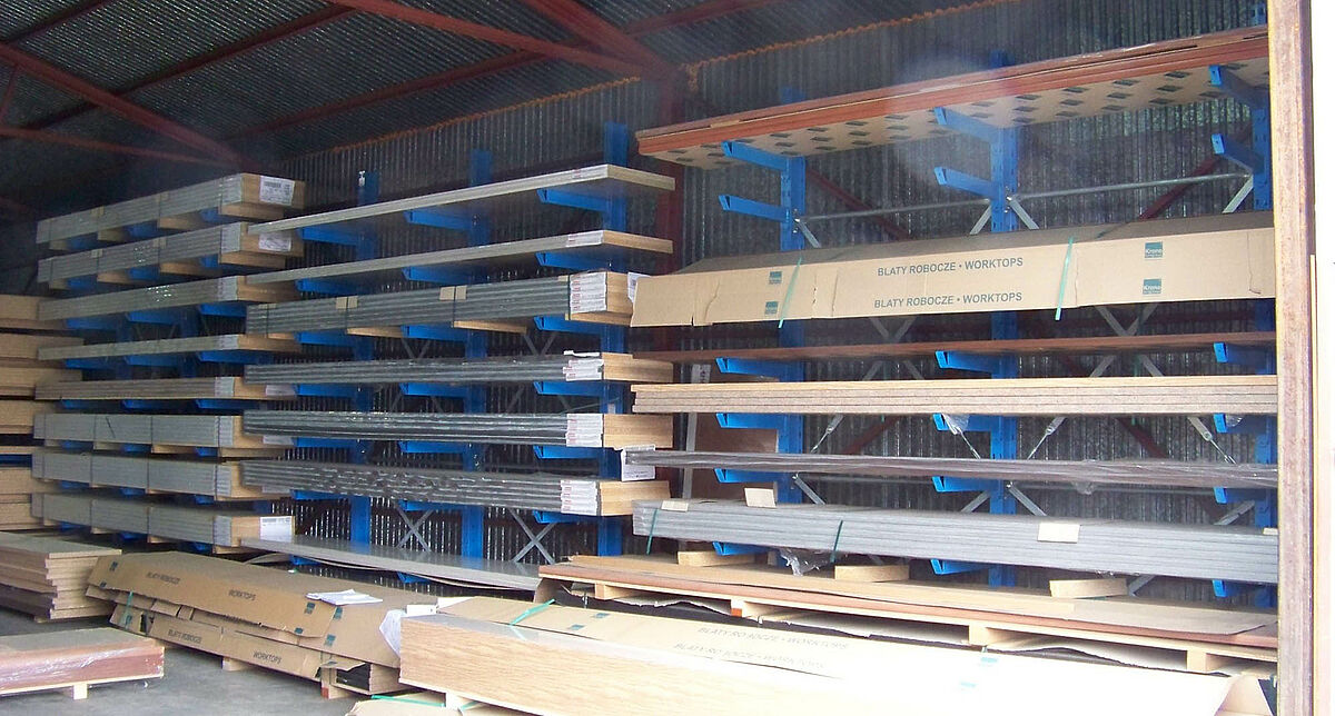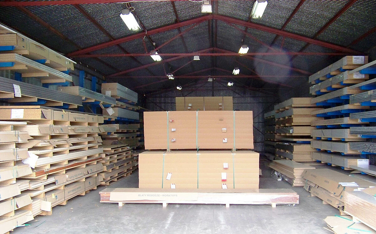 Para utilizar da melhor maneira a superfície de armazenamento, a empresa polonesa Damar equipou o seu depósito com estantes com braços portadores e estantes para paletes da empresa OHRA. Os sistemas de estantes permitem não só um armazenamento organizado dos painéis de aglomerado OSB e das bancadas para cozinha, como também são configuráveis de forma flexível. Assim, os sistemas podem ser adaptados às condições de câmbio do depósito e ser finalizados individualmente segundo a situação do prédio.
