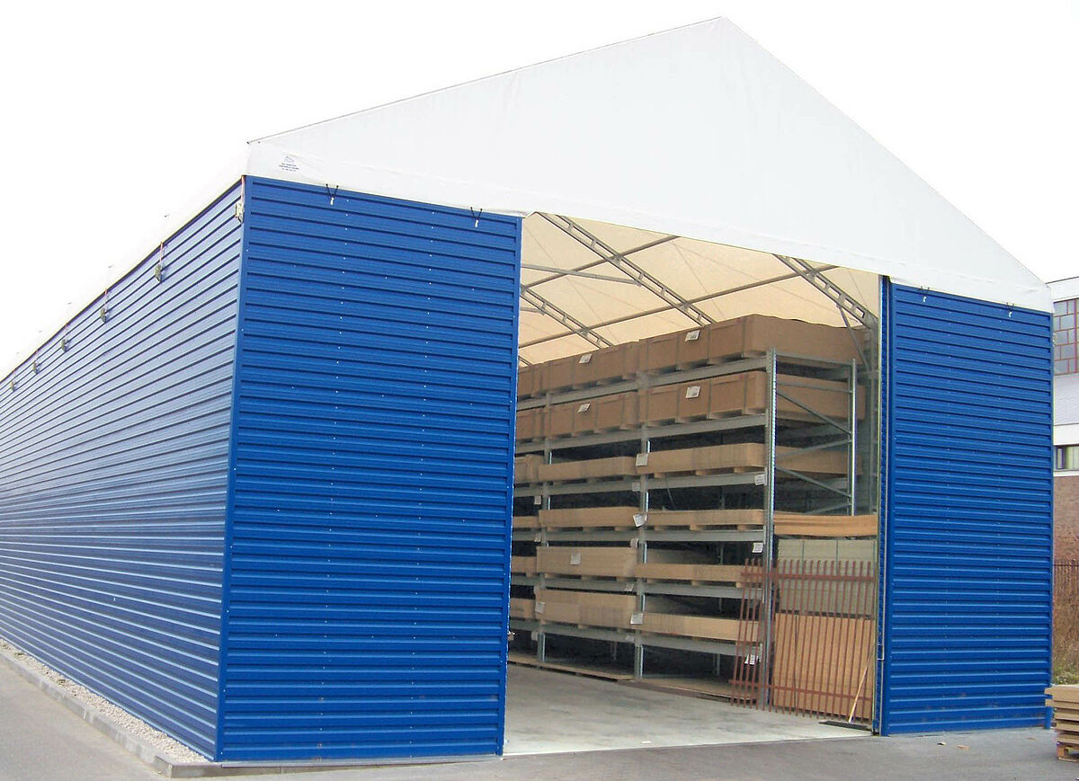 Os primeiros investimentos da Damar em estantes da empresa OHRA ocorreram já há seis anos. A empresa, convencida da qualidade, agora equipou também o mais novo depósito com estantes para paletes do especialista em estantes com braços portadores e para paletes de Kerpen. Aqui são armazenados painéis de aglomerado de 2070 x 2800 em pacotes de até 1.800 quilogramas. A particularidade nisso: o depósito foi instalado em uma tenda pavilhão. Aqui foi demonstrada a elevada flexibilidade das soluções de estantes da OHRA, uma vez que para utilizar o espaço da melhor forma possível, a distância entre as estruturas das estantes foi adaptada exactamente à construção da tenda pavilhão. Para isso, a OHRA modificou o comprimento das longarinas para 2.950 milímetros, de maneira que as estruturas das estantes dos painéis encontram-se exactamente embaixo dos apoios do teto da tenda. Desta forma o espaço existente disponível pode ser utilizado da melhor maneira possível.