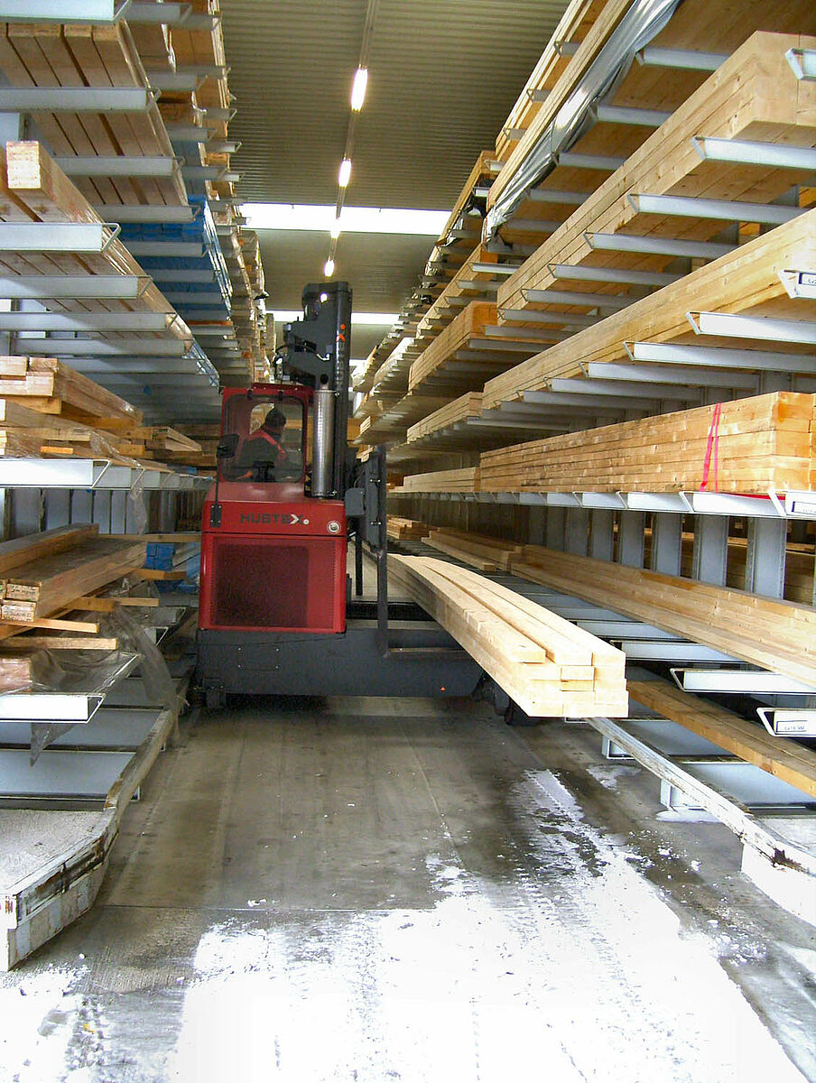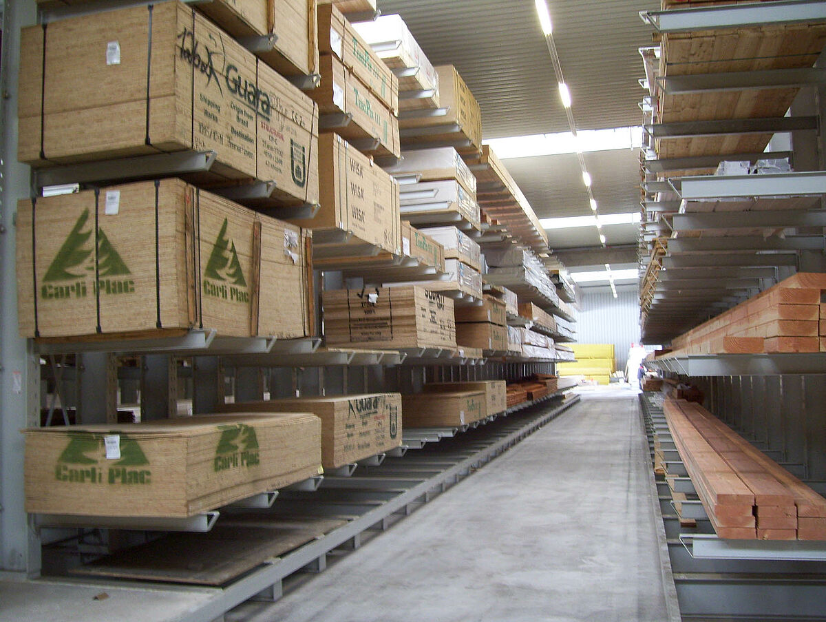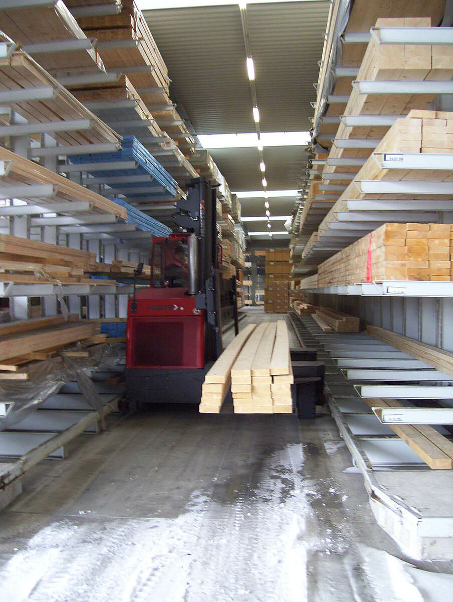 Em apenas duas semanas os especialistas de Kerpen montaram 236 postos de armazenamento para madeira de construção e madeira laminada em fileiras de estantes com braços portadores de 40 e 50 metros de comprimento e 6,20 metros de altura. Assim resultaram no total 2.800 metros de níveis de estantes para madeira longa. Além disso, foram produzidos 300 postos em estantes para paletes e estantes com braços portadores nos quais são armazenados os produtos para paletes e o sortimento básico. O armazém é operado por duas empilhadeiras laterais Hubtex e uma empilhadeira frontal Linde. Só nos primeiros seis meses após a colocação em funcionamento já foram movimentados ao redor de 3.300 metros cúbicos de madeira.