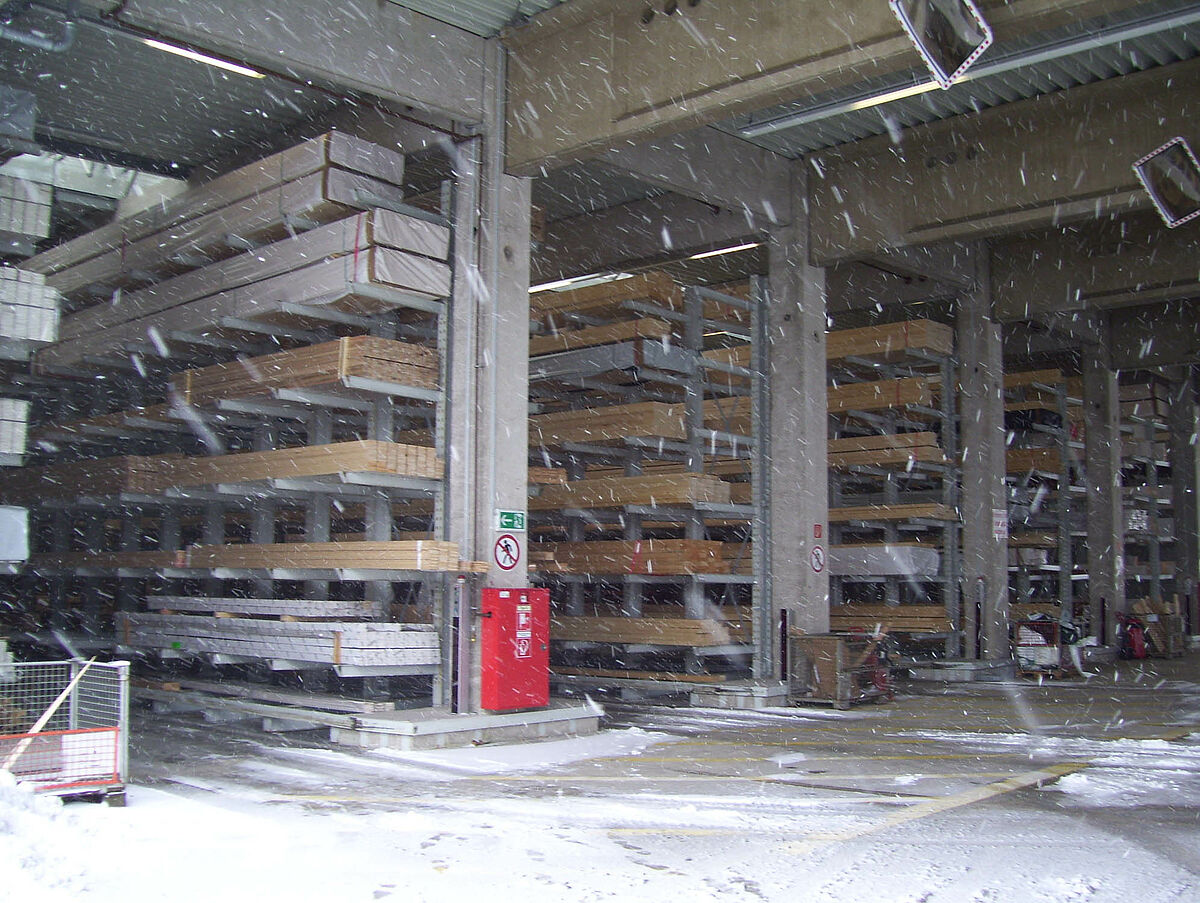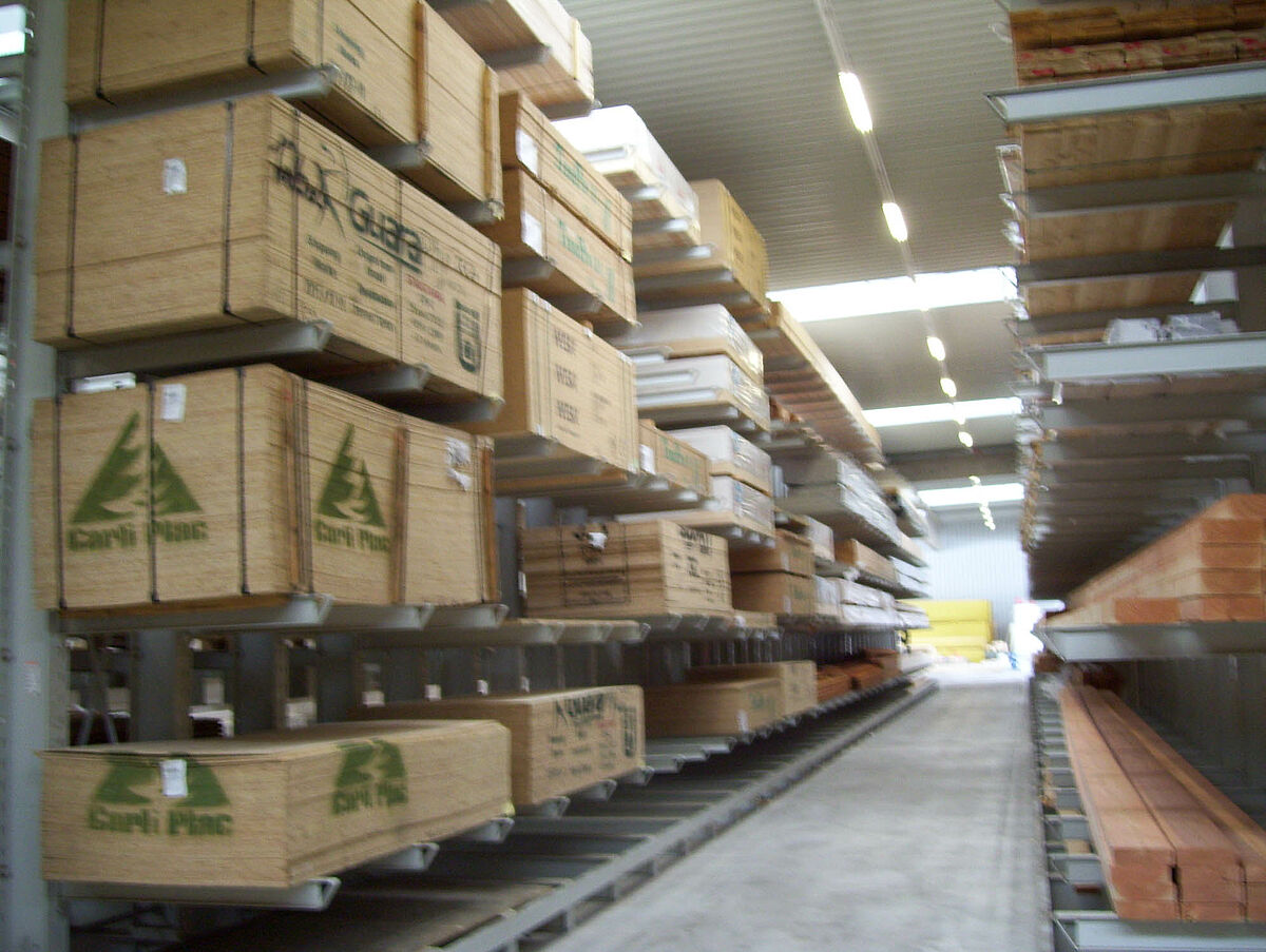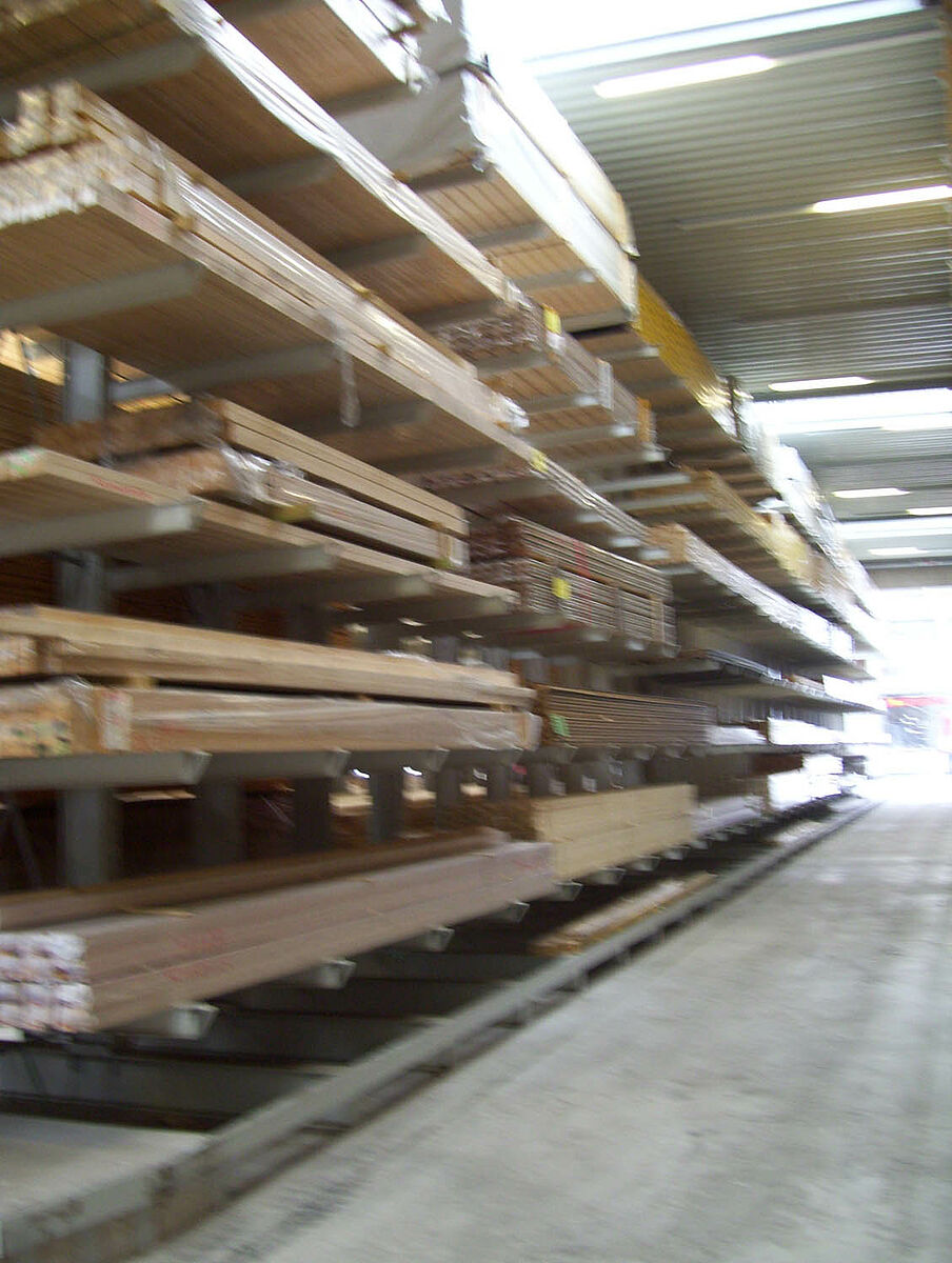 Em apenas duas semanas os especialistas de Kerpen montaram 236 postos de armazenamento para madeira de construção e madeira laminada em fileiras de estantes com braços portadores de 40 e 50 metros de comprimento e 6,20 metros de altura. Assim resultaram no total 2.800 metros de níveis de estantes para madeira longa. Além disso, foram produzidos 300 postos em estantes para paletes e estantes com braços portadores nos quais são armazenados os produtos para paletes e o sortimento básico. O armazém é operado por duas empilhadeiras laterais Hubtex e uma empilhadeira frontal Linde. Só nos primeiros seis meses após a colocação em funcionamento já foram movimentados ao redor de 3.300 metros cúbicos de madeira.