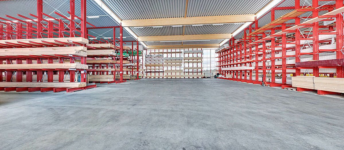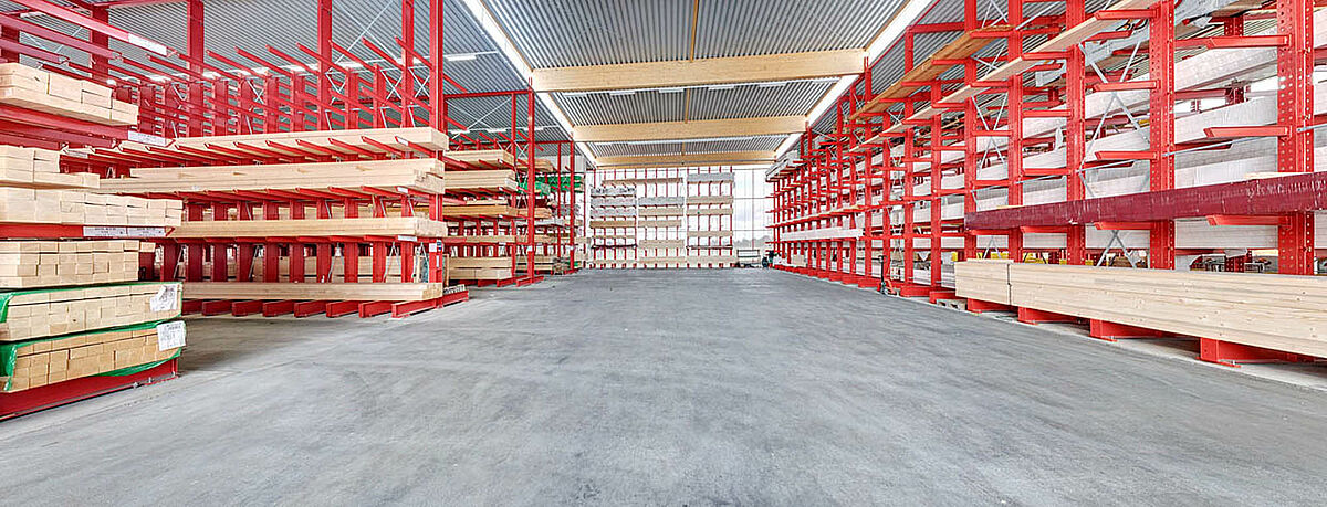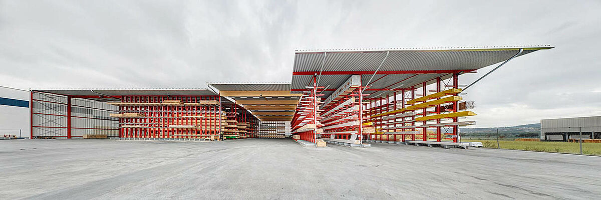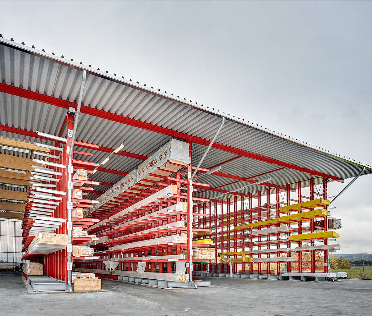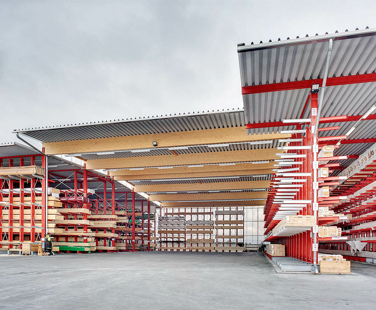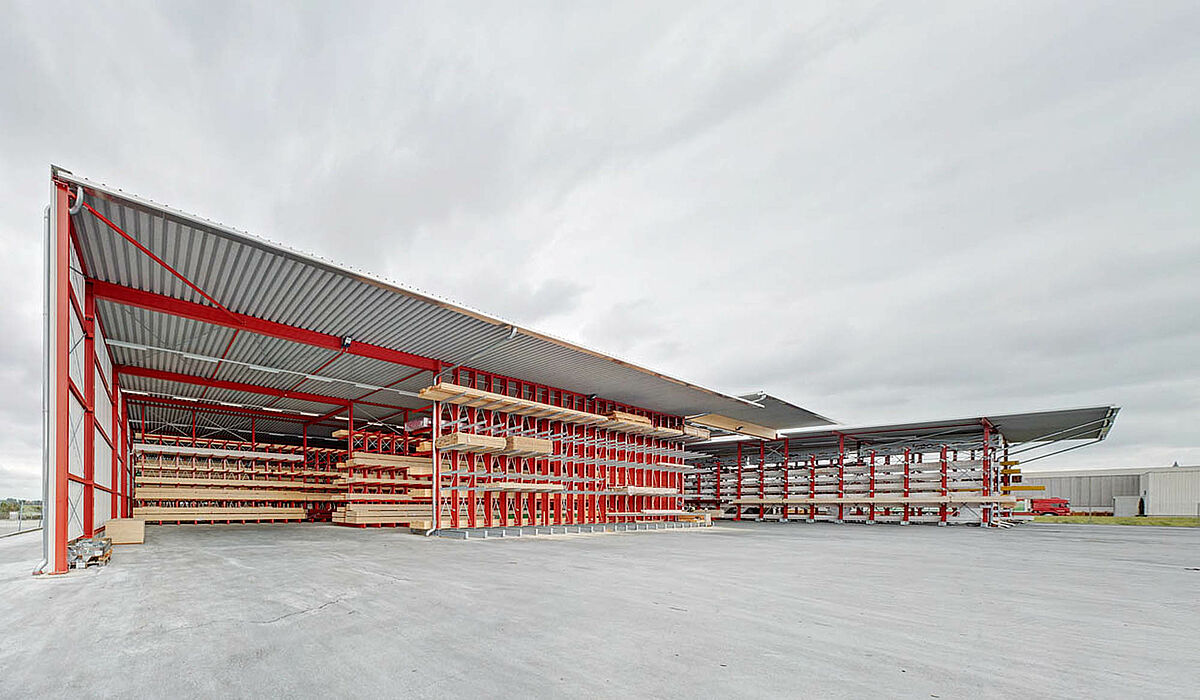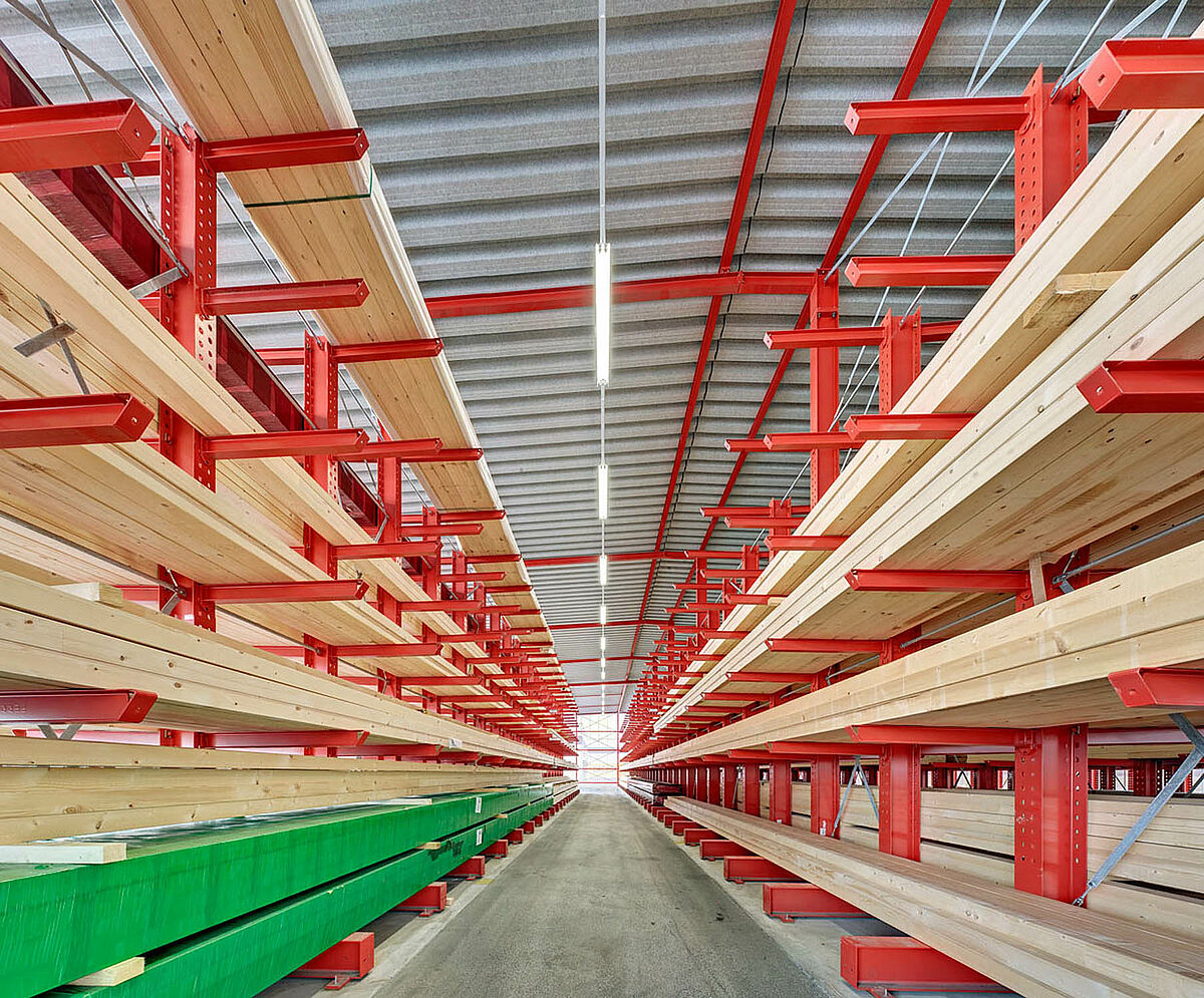 As estantes de dupla face Cantilever atingem 8.600 milímetros no ponto mais alto e oferecem 6 níveis de armazenamento em cada lado. Com uma capacidade de carga de 800 kg por Cantilever, se pode armazenar dessa maneira, por exemplo, uma série de estantes com 33 prateleiras, com um peso total de 26,4 toneladas de material por superfície. A área de carga total para o armazenamento de madeira é de aprox. 3.100 m2. A altura é de 9.750 milímetros. Aqui devemos considerar que para a construção do telhado foi selecionada uma combinação de encapado com cola e aço pelo cliente. A extensão é de aprox. 21.000 milímetros. O cliente pôde economizar dinheiro na realização dessa produção.