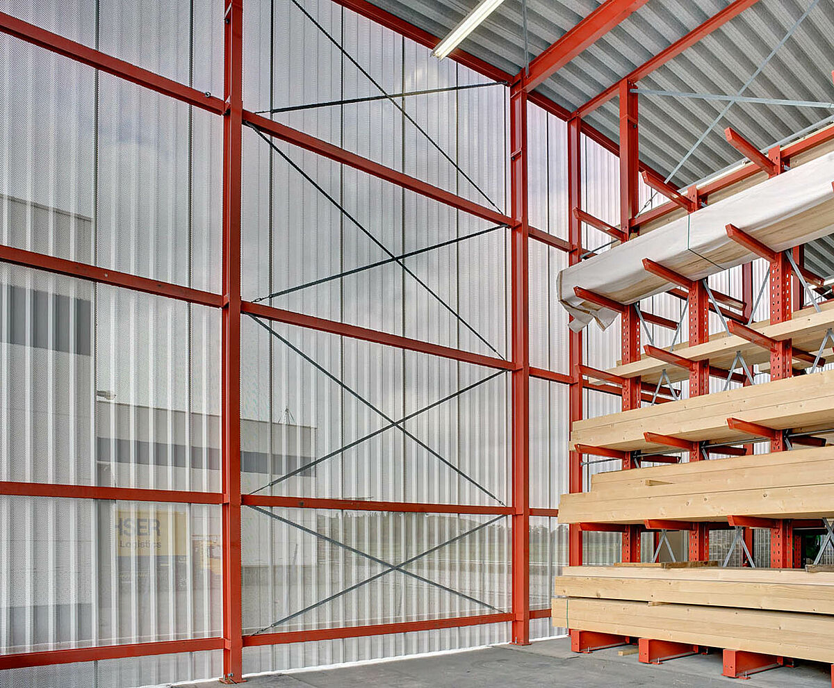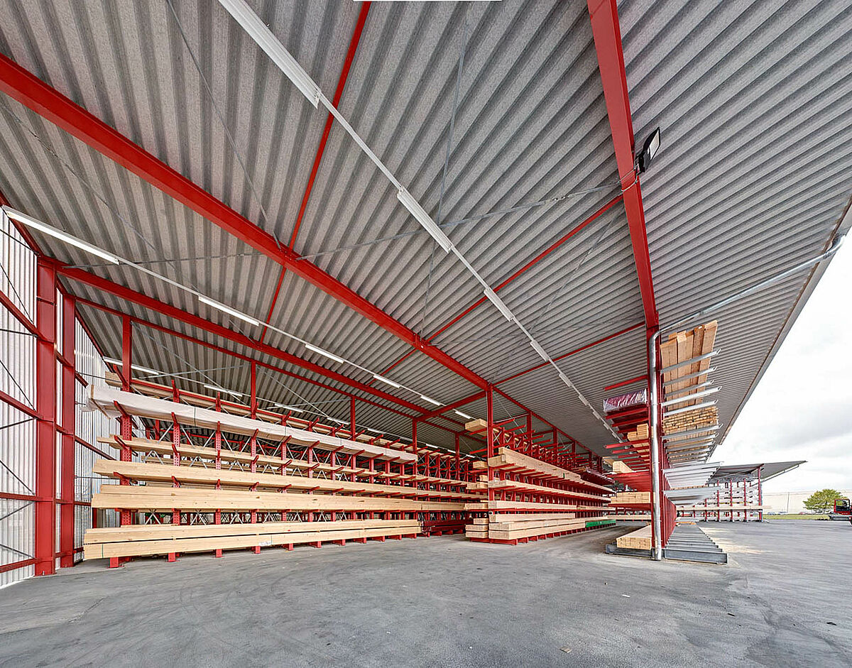 Naturalmente, toda a estrutura de aço foi revestida em casa cor RAL 3000 conforme solicitado pelo cliente. Parte das bases das estantes Cantilever foram entregues galvanizadas para evitar ferrugem, mesmo em caso de chuvas. Finalmente, a execução foi realizada a partir das paredes laterais e traseiras do sistema de prateleiras com uma folha perfurada em trapezoidal. Graças à distribuição especial dos furos, a placa é em parte resistente a chuva e ao vento, permanecendo em outra parte transparente e respirável.