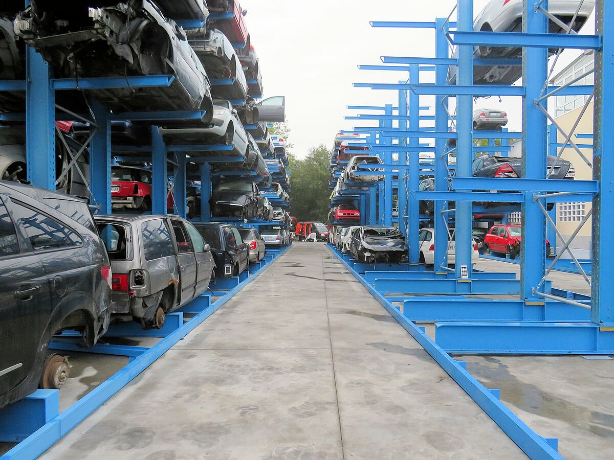 A Desguace Auteco também instalou estantes cantilever especiais para o armazenamento de carrinhas: Eles oferecem dois níveis de armazenamento (incluindo a base), com o nível superior sendo instalado a uma altura de 2.300 milímetros. Dessa forma, veículos mais altos podem ser facilmente armazenados. Os braços cantilever presos num lado transportam até 1.200 kg, o que significa que os veículos em fim de vida útil aqui armazenados podem pesar até 2,4 toneladas.
