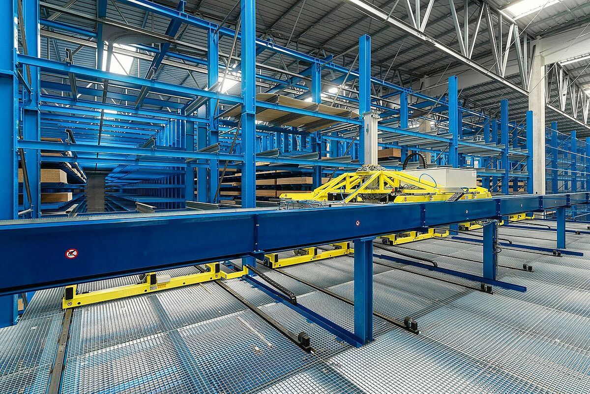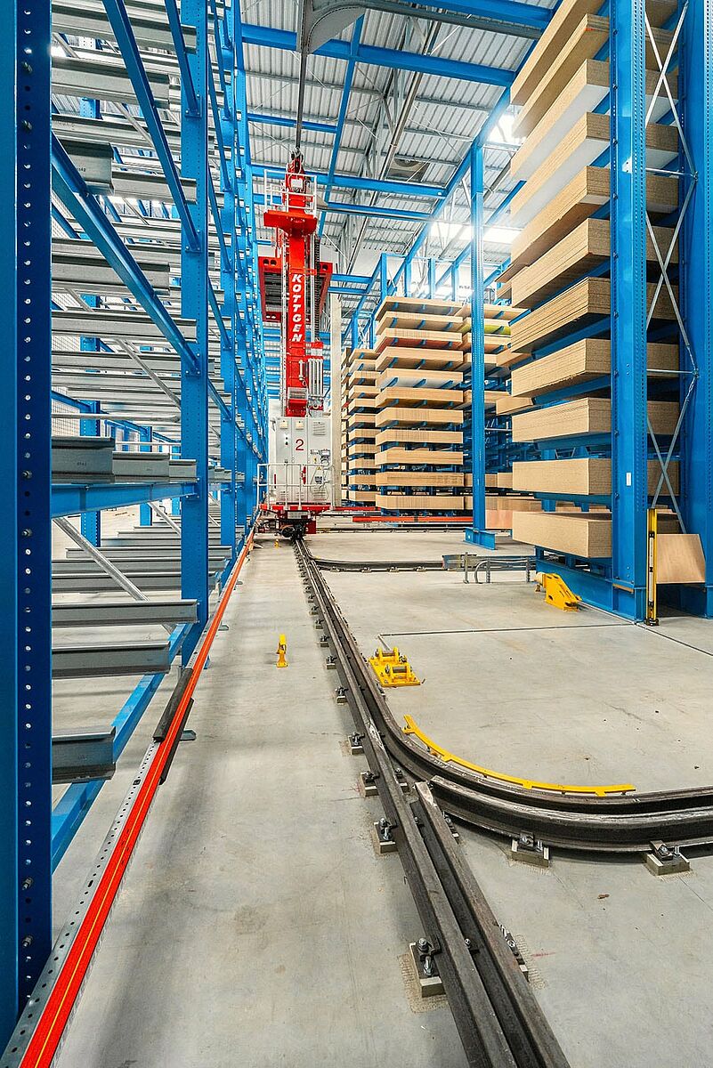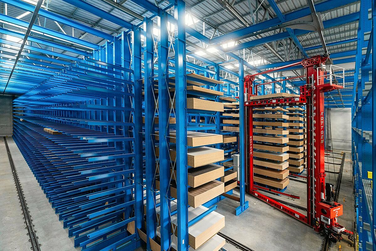 No total a OHRA forneceu sete estantes cantilever com duplas e duas estantes simples, com 57 metros de comprimento. Os oito corredores são operados por dois transelevador. Nos corredores das estantes, é operado por dois transelevador. Os paletes são armazenados de forma caótica, que depois são transportadas para uma estante transversal instalada na parte frontal dos corredores da estante. Diretamente conectada a estas estantes, está uma plataforma de armazenamento fornecida pela OHRA. Foi instalado um sistema automático de vácuo na plataforma, que prepara os painéis individuais necessários para até cinco pedidos de clientes em paralelo. Os pedidos de clientes acabados são então transportados pelo transelevador para o ponto de transferência, de onde são finalmente retirados por um empilhador para expedimento.