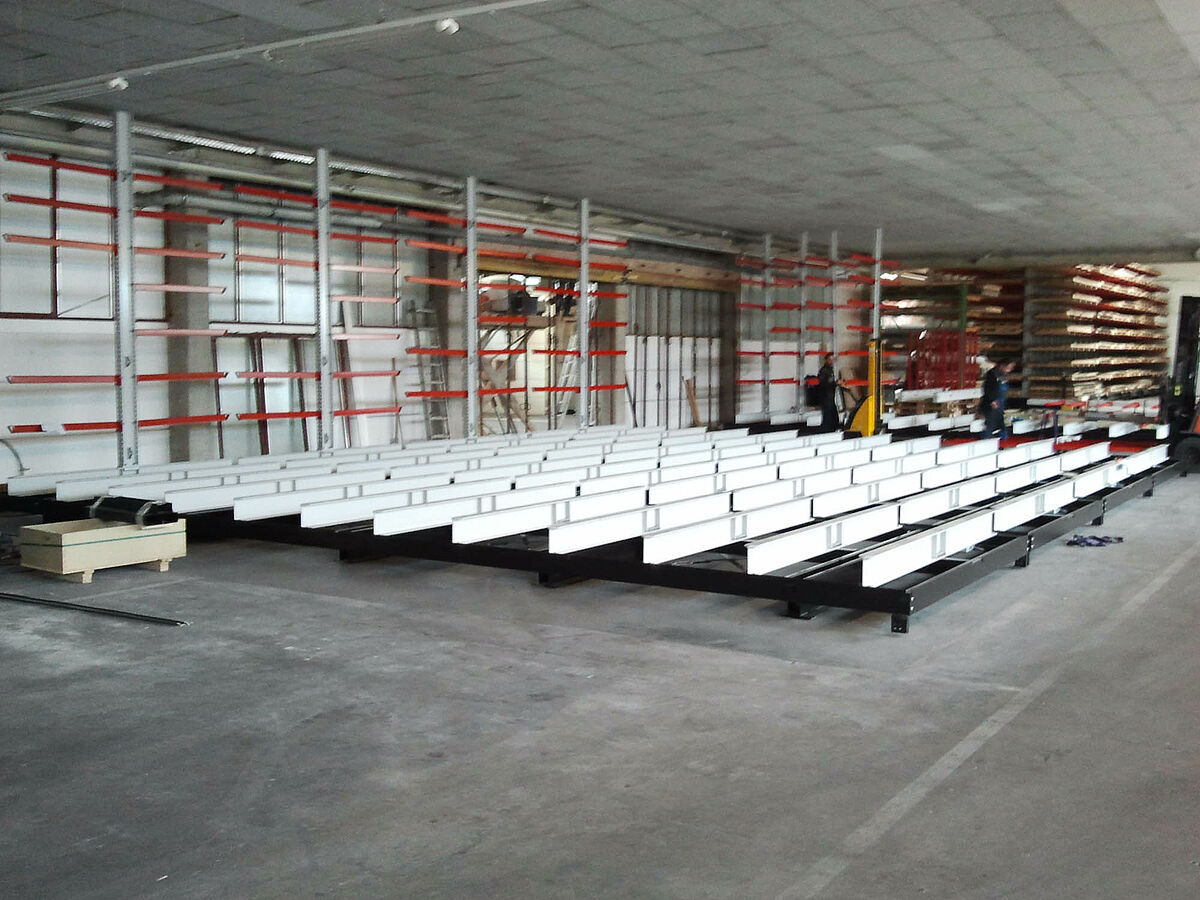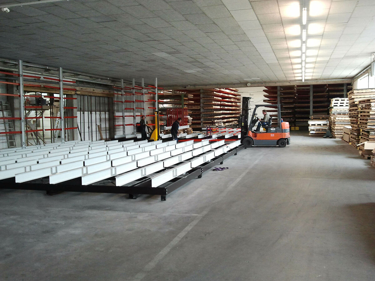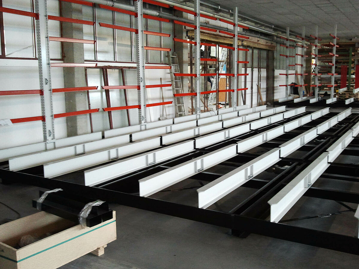 Ela encontrou a solução na empresa OHRA. A empresa com sede em Colónia especializada em estantes com braços portadores oferece um sistema no qual as estantes são montadas em bases deslocáveis. As estantes deslocáveis permitem quase 100 % mais de capacidade de armazenamento do que as estantes comuns montadas fixas. Os expertos da OHRA montaram na empresa erform um sistema com cinco estantes de dupla face com braços portadores de 9 metros de comprimento. Com uma altura de 4.080 milímetros puderam ser instalados sete níveis de estantes. Além destas estantes montadas sobre bases deslocáveis, uma estante fixa de uma face oferece mais superfície para armazenamento.