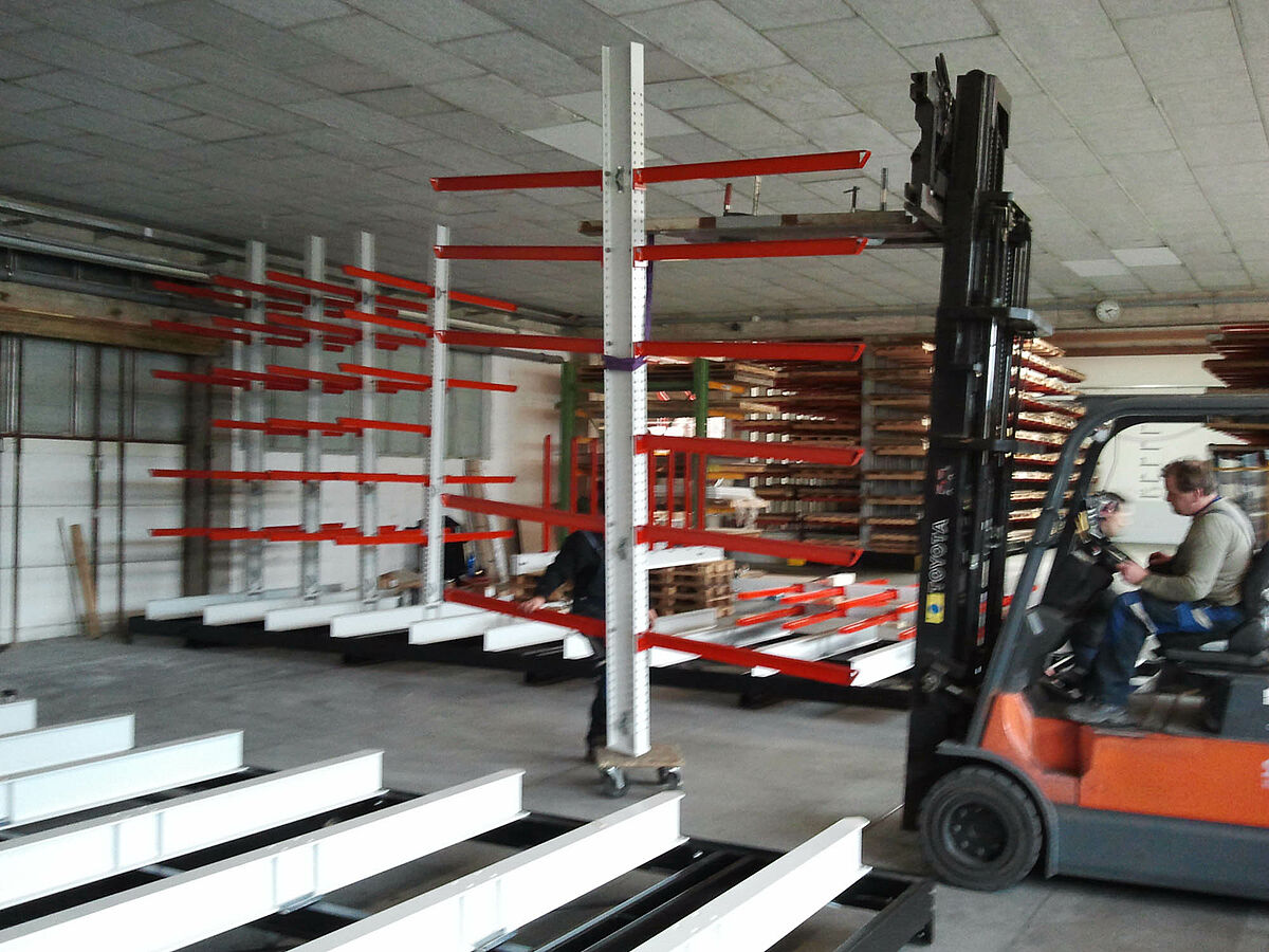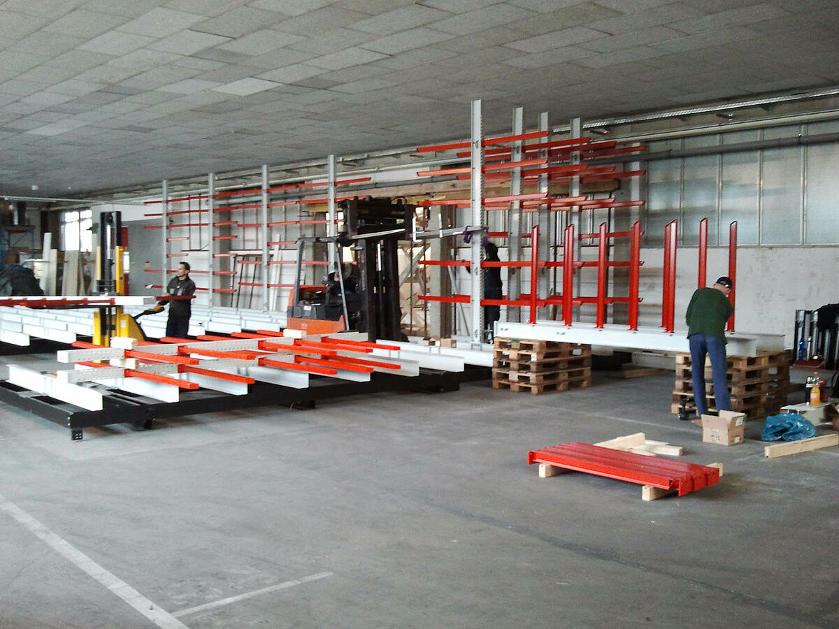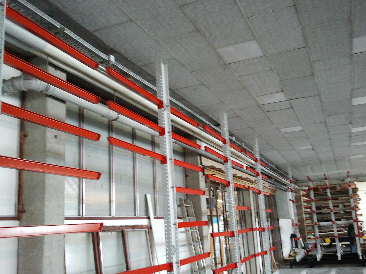 Ela encontrou a solução na empresa OHRA. A empresa com sede em Colónia especializada em estantes com braços portadores oferece um sistema no qual as estantes são montadas em bases deslocáveis. As estantes deslocáveis permitem quase 100 % mais de capacidade de armazenamento do que as estantes comuns montadas fixas. Os expertos da OHRA montaram na empresa erform um sistema com cinco estantes de dupla face com braços portadores de 9 metros de comprimento. Com uma altura de 4.080 milímetros puderam ser instalados sete níveis de estantes. Além destas estantes montadas sobre bases deslocáveis, uma estante fixa de uma face oferece mais superfície para armazenamento.