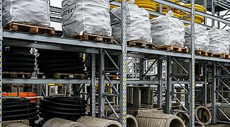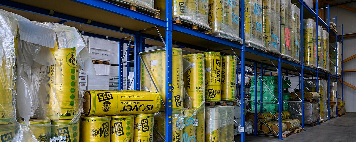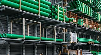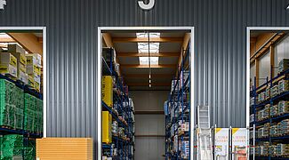 Devido aos diferentes materiais, a OHRA equipou as áreas de armazenamento com estantes cantiléver e porta-paletes Foram instaladas um total de 22 estantes, de uma e duas profundidades e com uma altura de até 7.500 milímetros. Cada estante é configurada individualmente para as diferentes mercadorias em termos de capacidade de carga, número de níveis de armazenamento e acessórios. Enquanto que as prateleiras interiores foram pintadas na cor desejada, as prateleiras exteriores são galvanizadas e assim protegidas contra intempéries. Algumas das estantes estão equipadas com postes de suporte ou grelhas, para serem tão flexíveis quanto possível no armazenamento de artigos de diferentes dimensões. Outra característica especial é a prateleira final do pavilhão: Foi concebida de forma a poder acomodar uma antepara entre as dimensões axiais - forma assim a parede traseira do edifício.