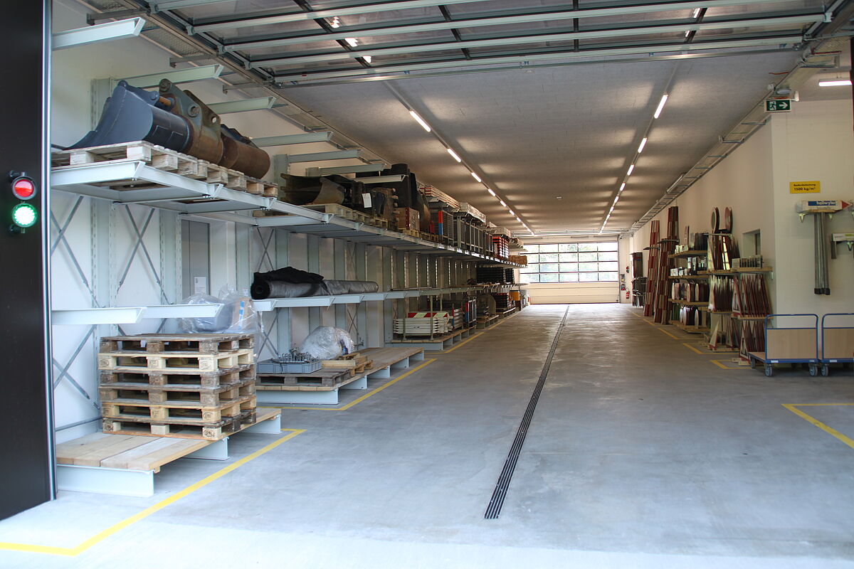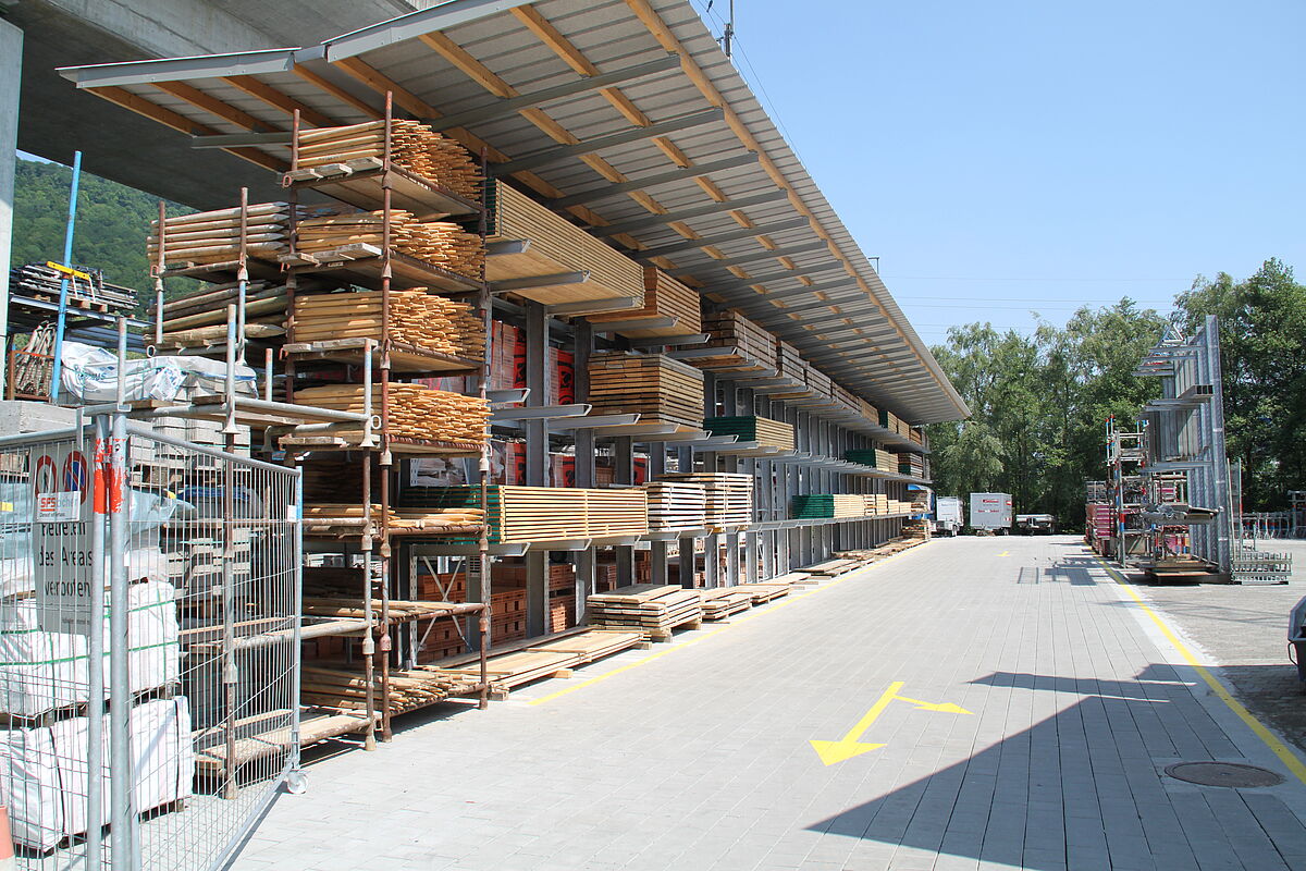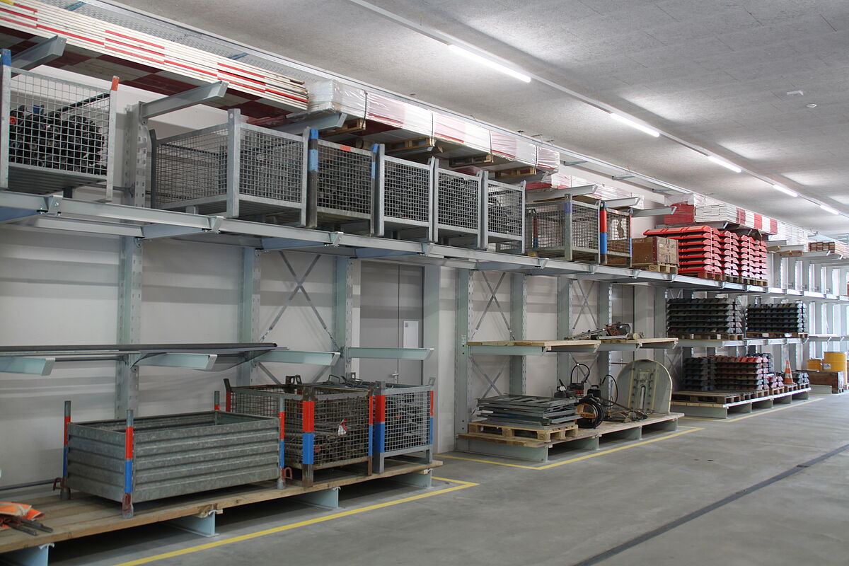 O centro operativo da empresa Gottlieb Müller em Rothrist funciona, desde o inicio de 2018, como plataforma operativa para os projetos da empresa nas áreas de construção subterrânea e de construção de edifícios. A fim de armazenar eficientemente a variedade de materiais de construção e o inventário, a empresa Gottlieb Müller decidiu usar dois tipos de estantes: O armazém está essencialmente equipado com 16 estantes para paletes com 3,5 metros de altura e 8,45 metros de comprimento. Cada prateleira das estantes comporta três euro-paletes ou caixas palete gradeadas, com peso de até 1.000 kg cada. Sete estantes cantilever unilaterais com 3,64 metros de altura disponibilizam espaço de armazenamento adicional no armazém. Algumas dessas estantes estão equipadas com pontes de braços e prateleiras, para que, além de mercadorias longas, como tubos ou placas, possam ser armazenados transportadores de carga de várias dimensões, sem pilares a obstruir o acesso. Foram montadas outras estantes cantilever no espaço exterior; estas estantes estão protegidas por uma galvanização contra corrosão. Acima de tudo, domina uma fila de estantes com 43,5 metros de comprimento, cujos braços cantilever superiores estão projetados como braços de teto: Estas estantes suportam em cada lado um telhado de 2,7 metros de profundidade e ligeiramente inclinado. Assim, os materiais de construção de madeira armazenados estão protegidos das condições climatéricas. Os braços cantilever de cada estante têm uma capacidade de carga de 1.200 Kg cada.