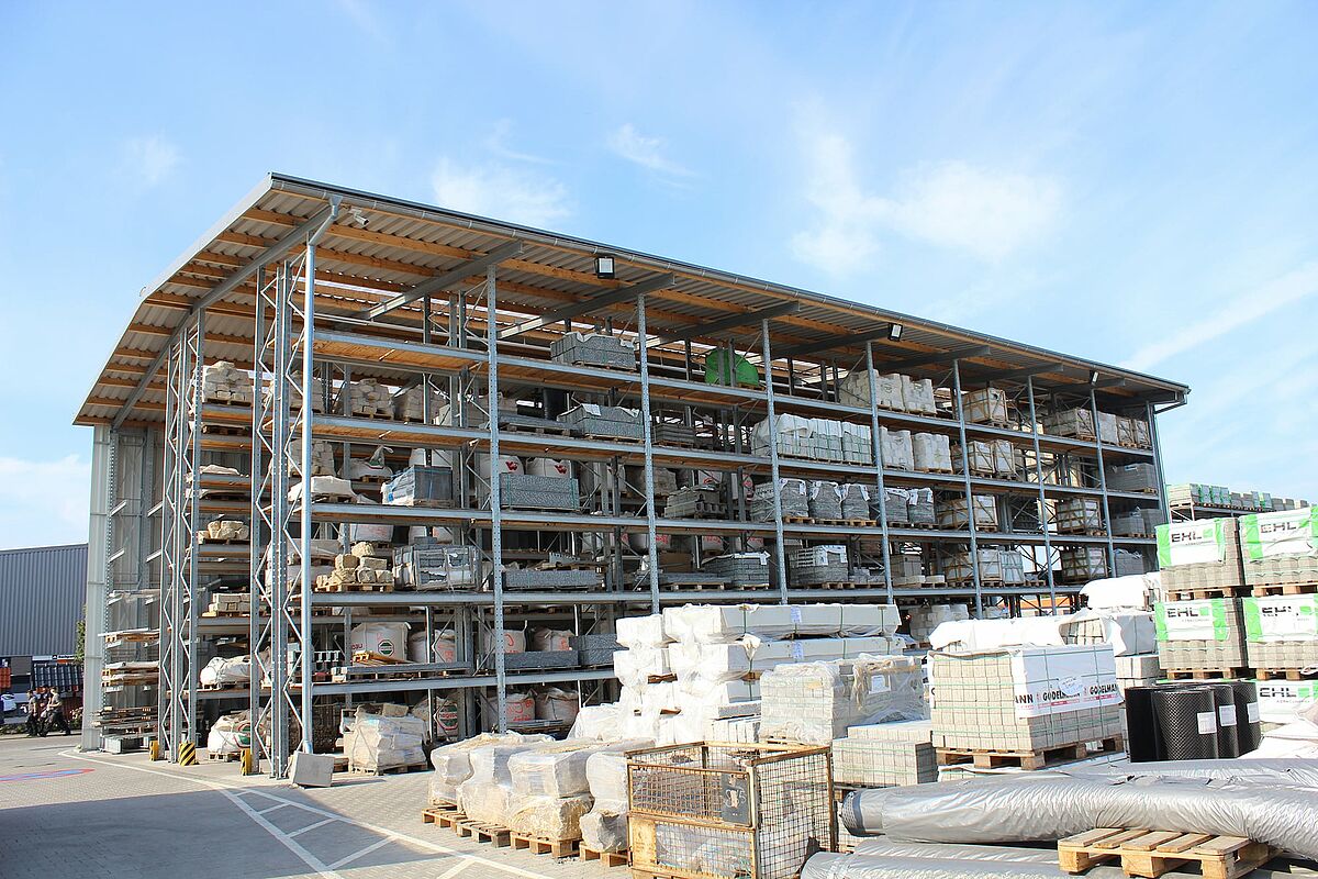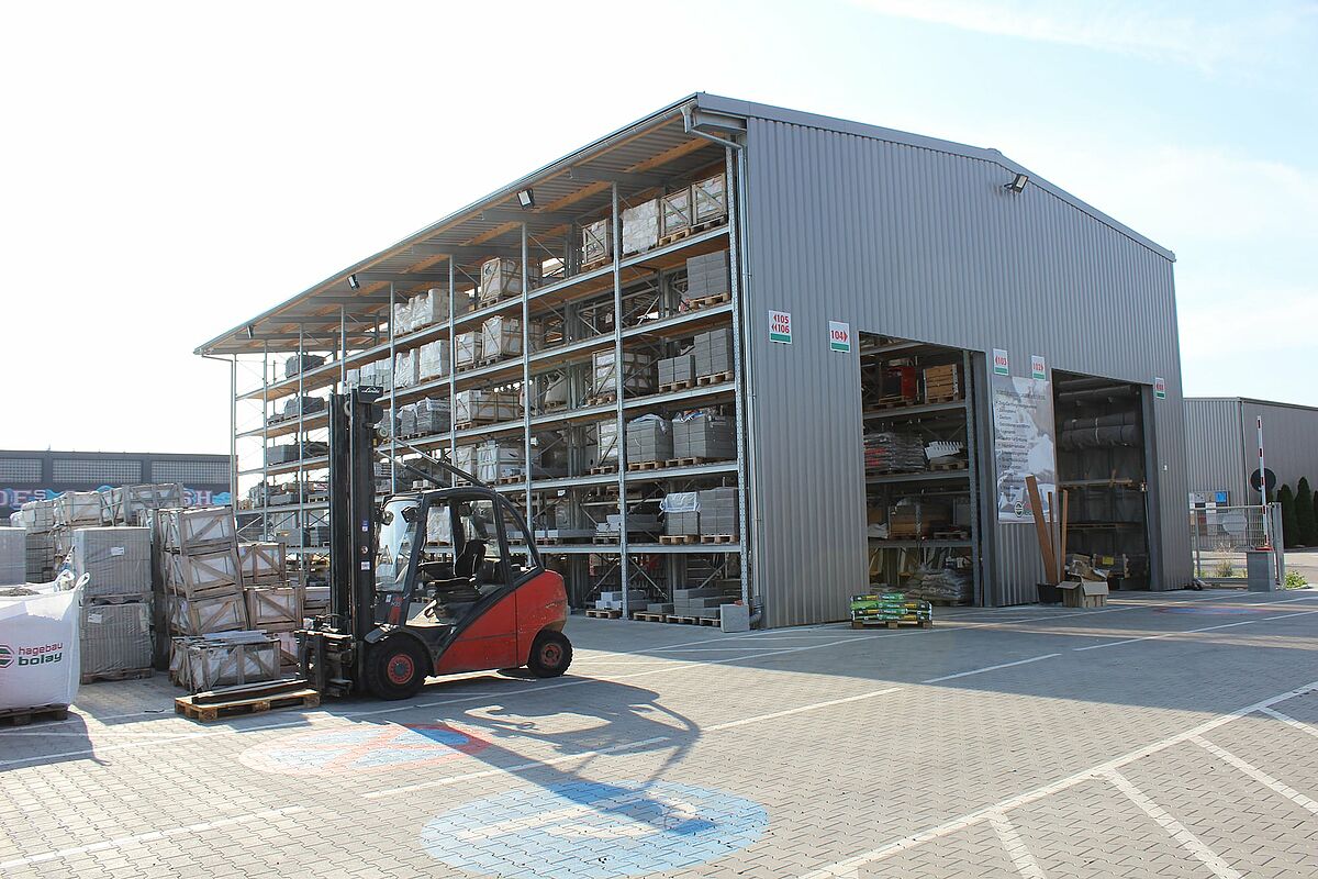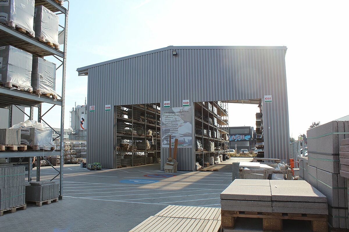O centro de bricolage Bolay, com sede em Rutesheim, perto de Estugarda, criou um novo espaço para produtos de jardim e madeira com estantes de braços e paletes da OHRA. A realização da nova área de armazém como um pavilhão parcialmente fechado em construção de sistema de estantes - aqui os suportes das estantes servem ao mesmo tempo como estrutura de suporte de carga para telhado e parede - tornou possível um tempo de construção particularmente curto.