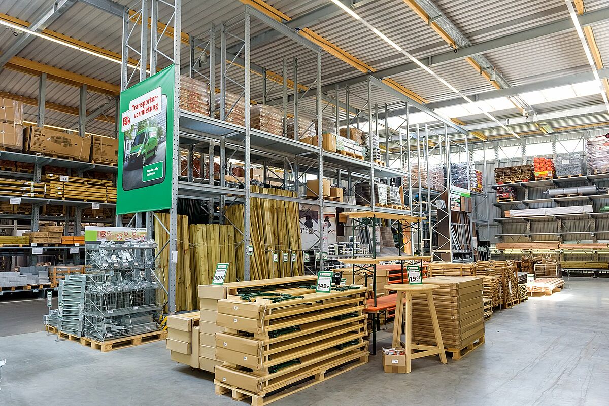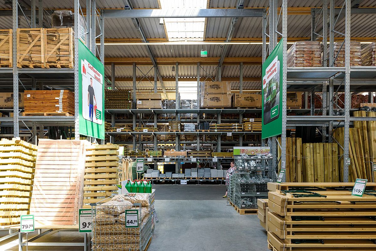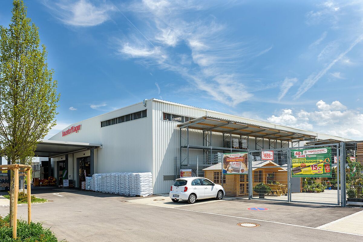 A gama completa de produtos Hagebau com centro de jardinagem e comércio de material de construção pode ser oferecida na espaçosa área de vendas do local aberto no final de 2018. O pavilhão autoportante cobre uma área de cerca de 2.000 metros quadrados.