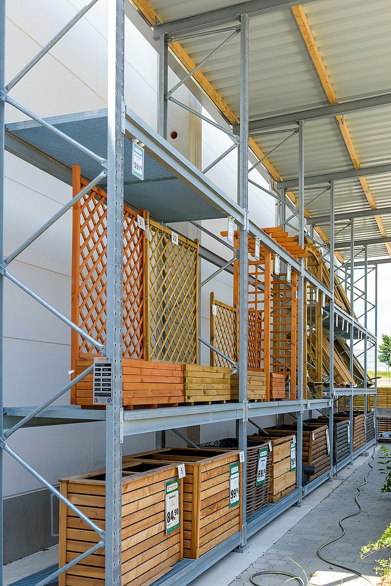 Para armazenar os artigos de jardim e madeira, a Jos. Schneider decidiu numa mistura, até 48 metros de comprimento, de estantes cantilever e de paletisação. Para realizar um armazenamento contínuo de vários artigos nas estantes de braços, todos os níveis de armazenamento foram equipados com grades. Utilizando perfis de aço de paredes sólidas para todos os elementos de suporte de carga, as estantes da OHRA atingem uma alta capacidade de suporte de carga, além disso, os perfis podem sofrer golpes elásticos e manter as suas propriedades estáticas permanentemente. Eles também fornecem uma base permanente para o telhado e as paredes.