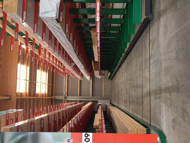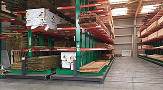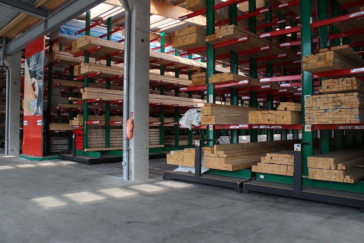 No armazém, os materiais de construção são fornecidos de acordo com as encomendas de artesãos e empreiteiros privados. Os artigos armazenados incluem vários materiais de construção, inclusive madeiras com 13 metros de comprimento e variados artigos ensacados. A fim de oferecer aos clientes a mais ampla gama possível de materiais, a modernização baseou-se essencialmente no aumento da capacidade de armazenamento - até agora os produtos estavam armazenados exclusivamente em estantes cantilever de várias filas.