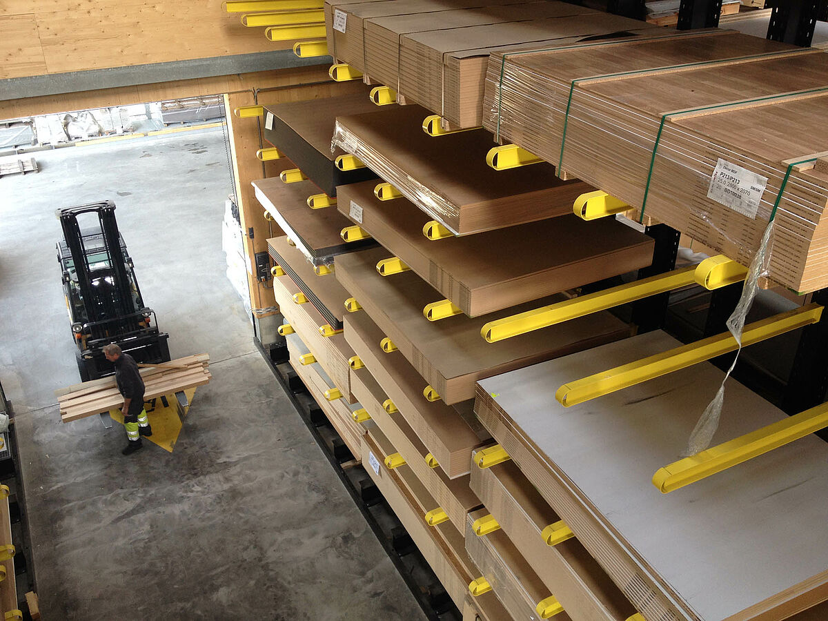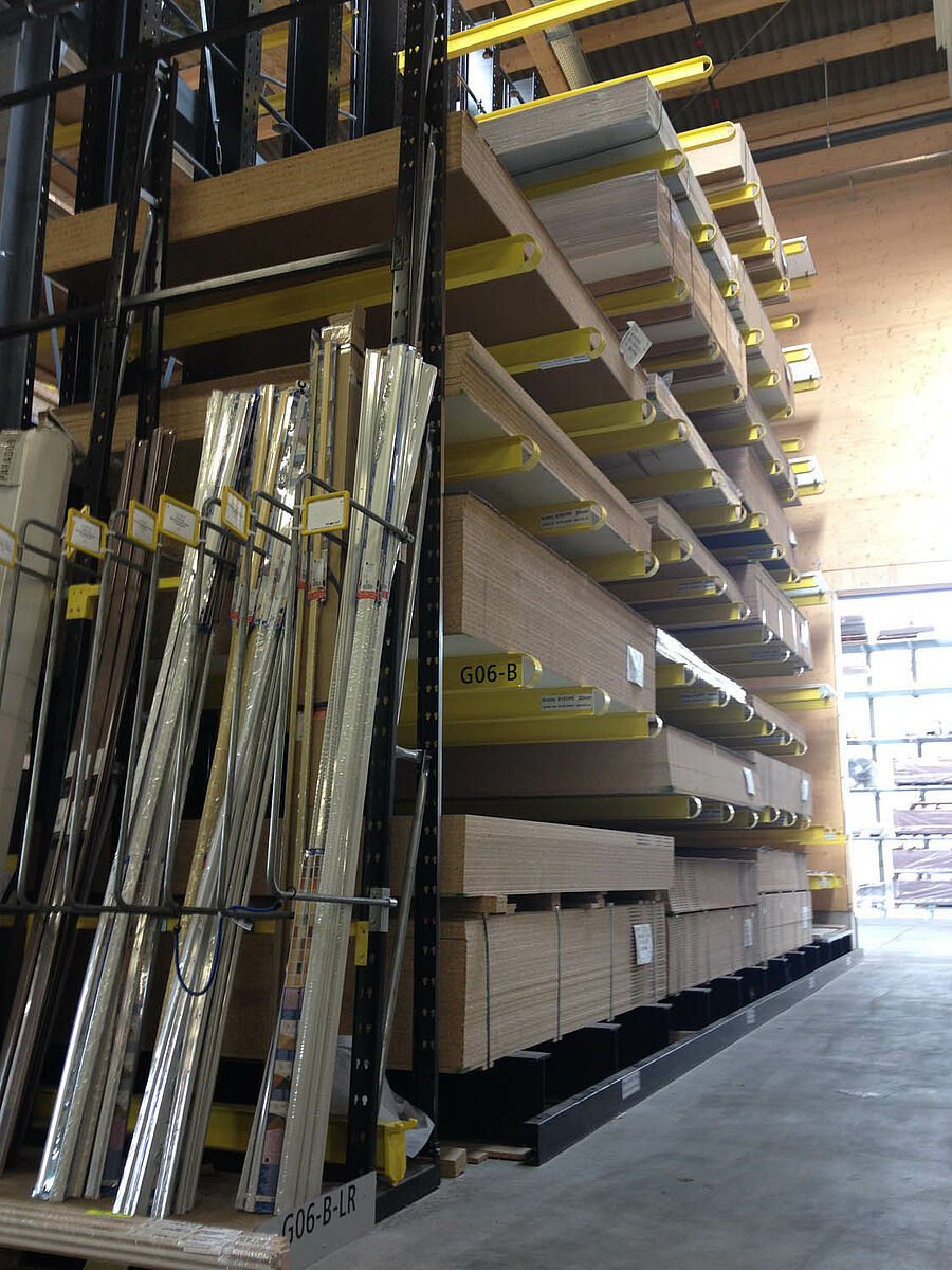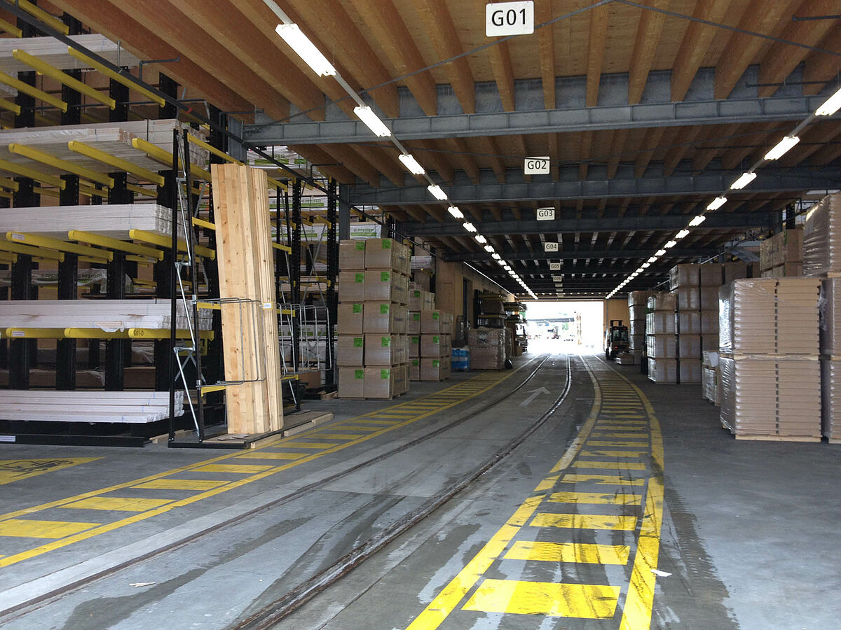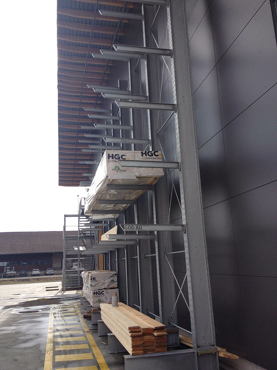 O depósito em Biel está dividido em duas zonas drive-thru sobre aproximadamente 3000 metros quadrados. Na planta a OHRA montou quase 600 metros contínuos de estantes com braços portadores de 9 metros de altura, sete níveis de armazenamento e braços portadores com 2,5 metros de profundidade que são operados por empilhadeiras de quatro vias. Estantes verticais no final das fileiras de estantes também permitem um armazenamento claro de sarrafos, perfis e tubos. Na área externa as estantes para paletes e as estantes com braços portadores no modelo galvanizado em quente oferecem espaço para mais 600 paletes. Para o armazenamento de materiais isolantes está integrada uma plataforma de 1000 metros quadrados na construção da planta.