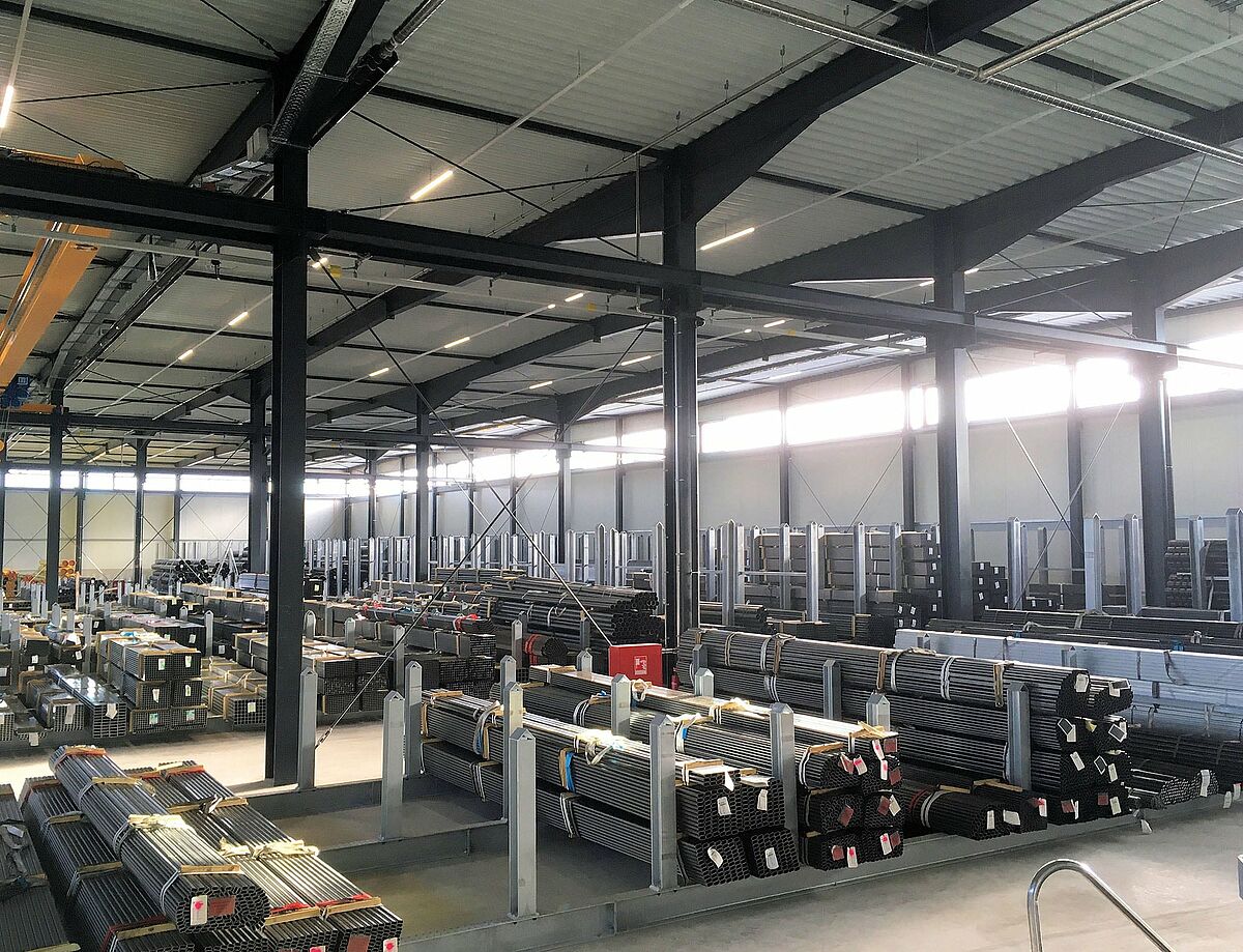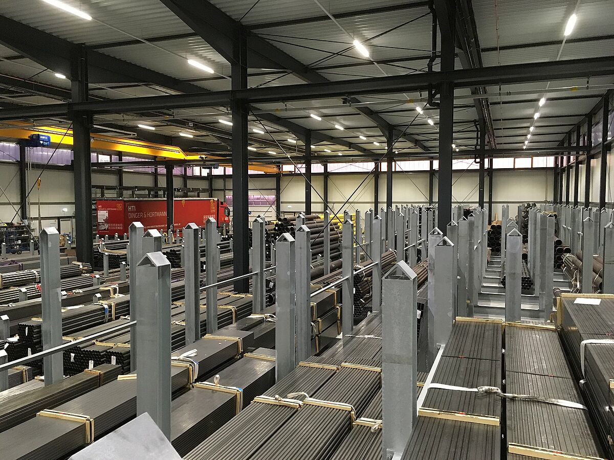 Com um novo armazém central de tubos em Chemnitz, a HTI Dinger & Hortmann, grossista especializada para a construção subterrânea e engenharia industrial, aumentou significativamente a eficiência dos seus processos de logística. Uma variedade de tubos ou conjuntos de tubos de diferentes comprimentos e pesos é armazenada em 30 estantes com fueiros da OHRA. O armazenamento plano permite a carga e descarga orientada dos tipos de tubo individuais com quatro guindastes de ponte. Além disso, os tubos podem ser transportados diretamente do camião para as estantes com braços verticais, sem ter de virar, pousar ou utilizar qualquer outro mecanismo de suspensão de carga. O acesso seletivo aos tubos, bem como a facilidade de manuseamento, permitem uma logística de tubos particularmente eficiente. Além disso, as estantes cantilever, também fabricadas pela OHRA, oferecem espaço compacto, nas paredes interiores e exteriores do pavilhão, para tubos mais leves de plástico ou de aço fino.