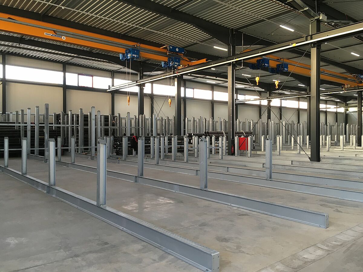 Enquanto os tubos ou conjuntos de tubos pesados e compridos podem ser armazenados nas estantes com braços verticais, os tubos leves são armazenados nas estantes cantilever da OHRA. As estantes, galvanizadas e com cerca de 5 metros de altura, foram instaladas, por um lado, nas paredes interiores do pavilhão e, por outro, nas paredes exteriores, em toda a volta. Os mandris de encaixe e as mangas nas extremidades dos braços de 1,4 metros de comprimento, com capacidade de carga até 640 kg, asseguram o armazenamento seguro dos tubos.
