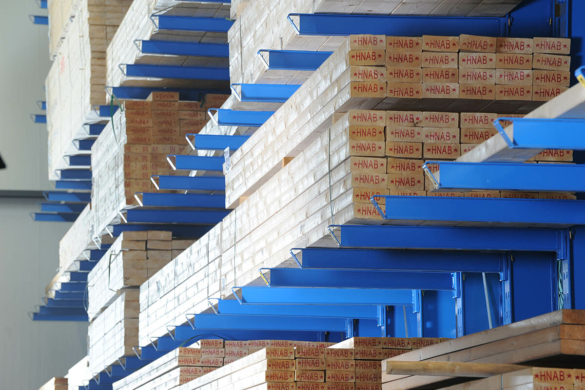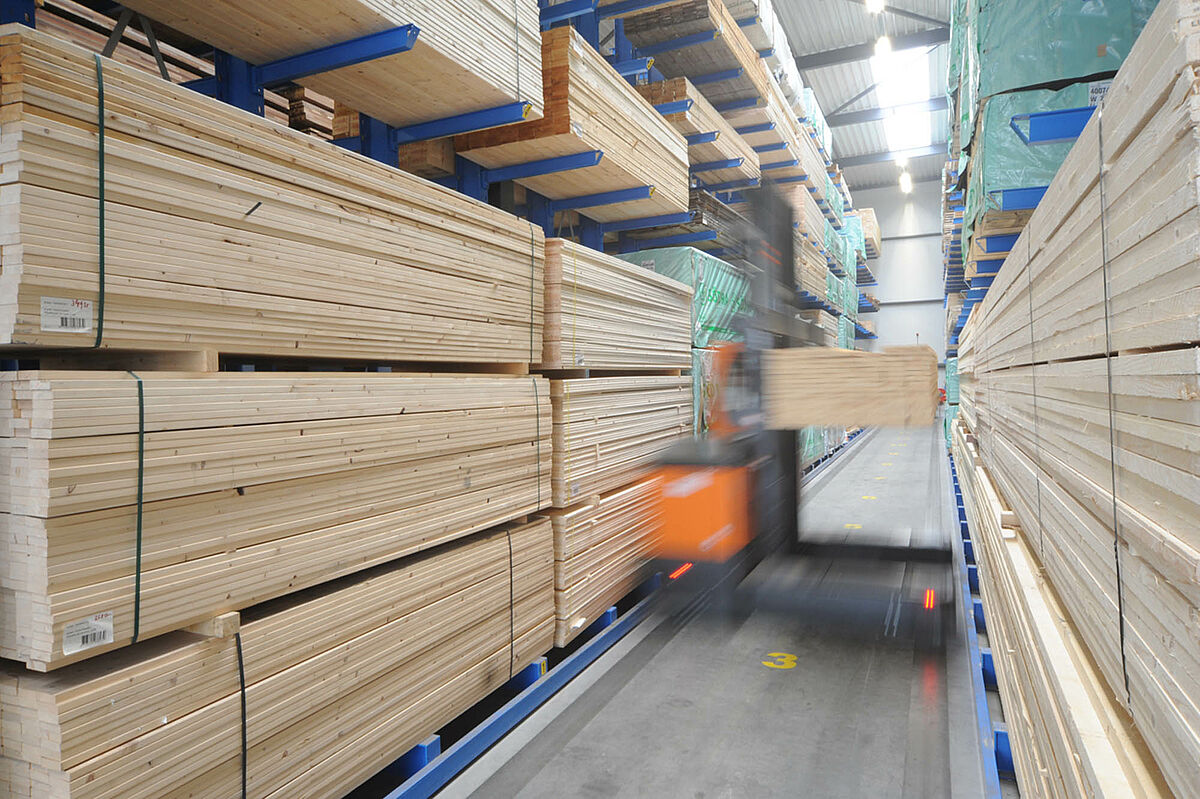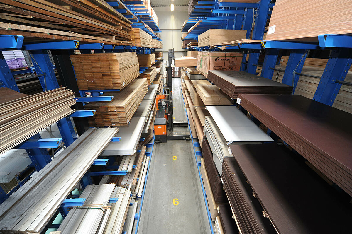 Para armazenar madeira, placas e materiais de construção de forma óptima, a OHRA apenas em dois meses montou onze fileiras de 36 metros de comprimento com estantes de braços portadores, bem como duas fileiras de estantes para paletes. Com uma altura de estante de 9 metros a superfície disponível é utilizada da melhor maneira possível e os trajectos para a empilhadeira de quatro vias são reduzidos. As estantes para paletes com largura de 2.700 milímetros sobre seis níveis oferecem um total de 462 postos. As estantes com braços portadores permitem o armazenamento de placas e de madeira longa em nove níveis, o comprimento do braço varia entre 1.100 e 1.550 milímetros. Como a ITS também distribui madeiras duras, algumas zonas das estantes também são executadas como estante para carga pesada.