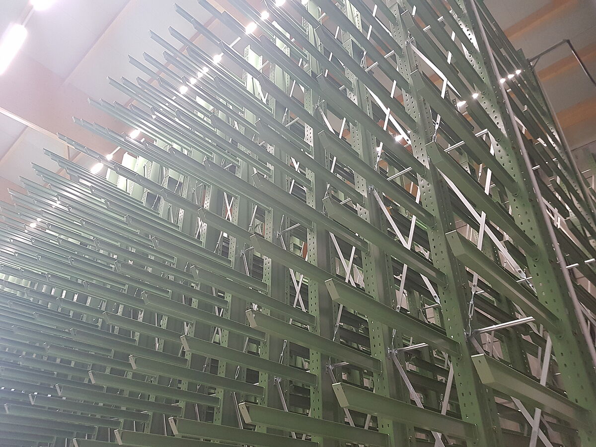 A OHRA equipou o armazém com quatro estantes cantilever duplas montadas sobre carris e uma estante cantilever unilateral instalada em cada lado frontal do armazém - formando por assim dizer a armação do sistema de transporte. Cada uma das estantes instaladas sobre carris tem 34 metros de comprimento e quase 11 metros de altura. Para alcançar as capacidades de carga elevadas necessárias, cada um dos 35 suportes das estantes é composto por perfis IPE 450 - os perfis mais fortes da gama OHRA: estes perfis proporcionam uma capacidade de carga de 19,2 toneladas nos 13 níveis de armazenamento. No total cada fila de estantes sobre carris oferece uma capacidade de armazenamento de 750 toneladas - com um peso líquido de 720 toneladas.