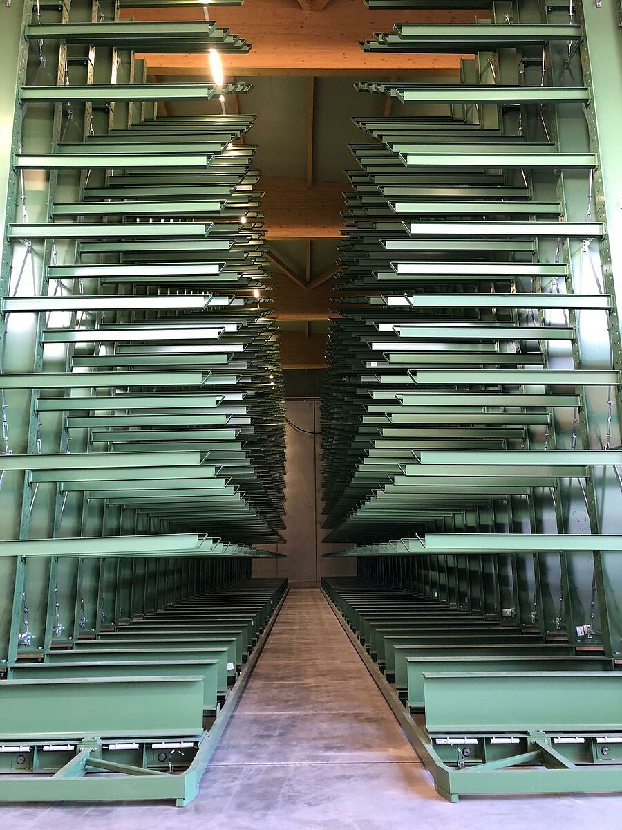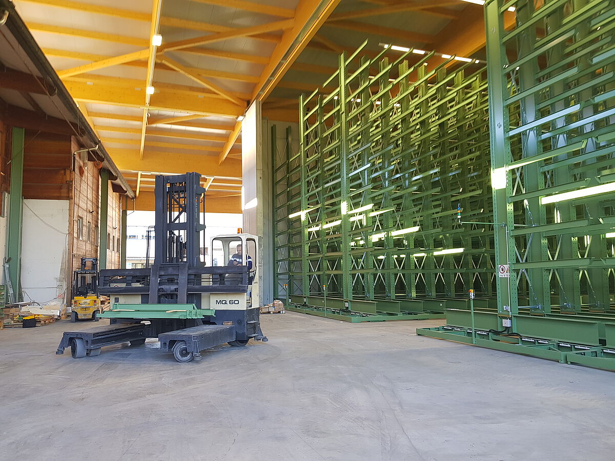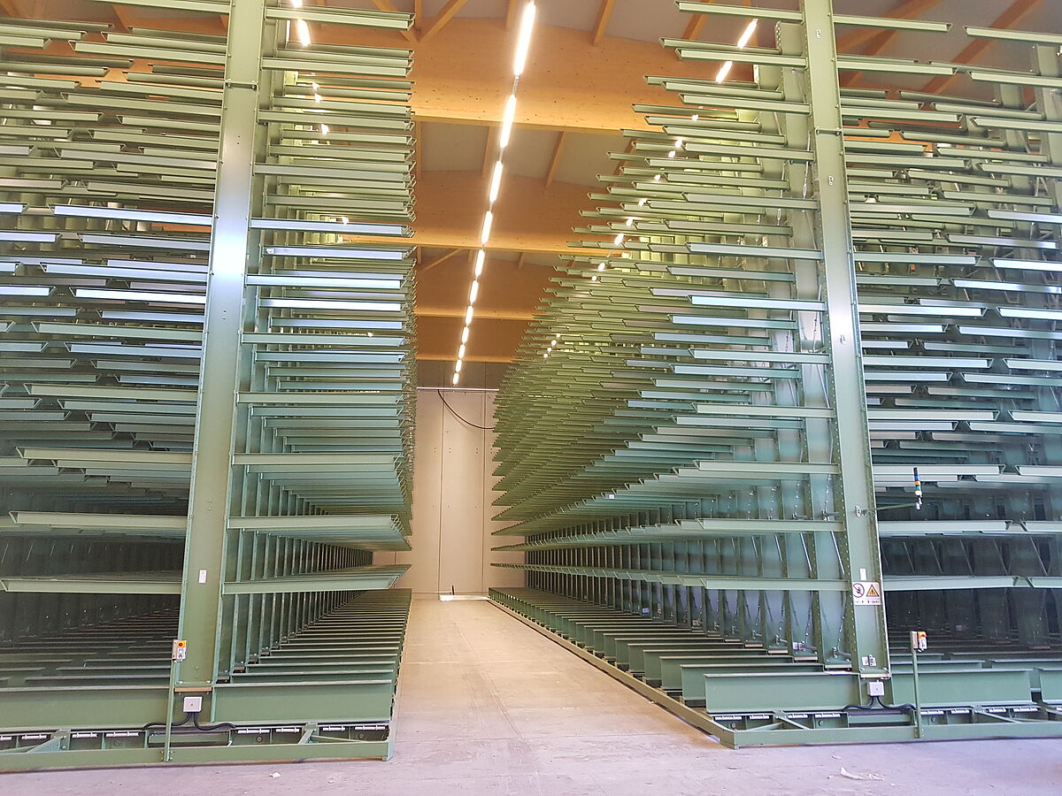 De forma a melhorar a disponibilidade de stock e a conseguir um maior espaço para uma maior gama de produtos, a empresa de comércio grossista de madeira do sul do Tirol, Karl Pichler, modernizou o seu armazém com sistemas de estantes sobre carris. O novo armazém tem espaço para armazenamento de 130 carregamentos de camião de painéis de madeira. Cada uma das estantes duplas tem capacidade de armazenamento de até 750 toneladas - com um peso líquido de 720 toneladas. A montagem das estantes sobre carris possibilita uma economia de espaço de armazenamento e, mesmo assim, um acesso rápido e fácil aos itens armazenados.