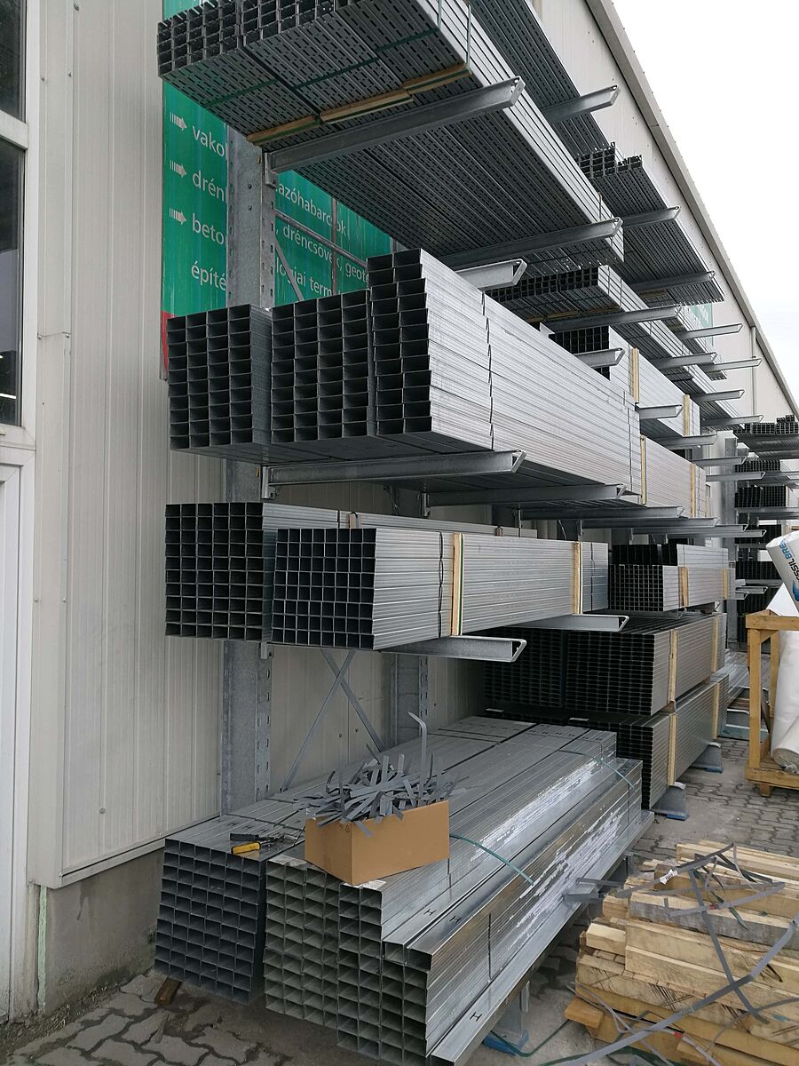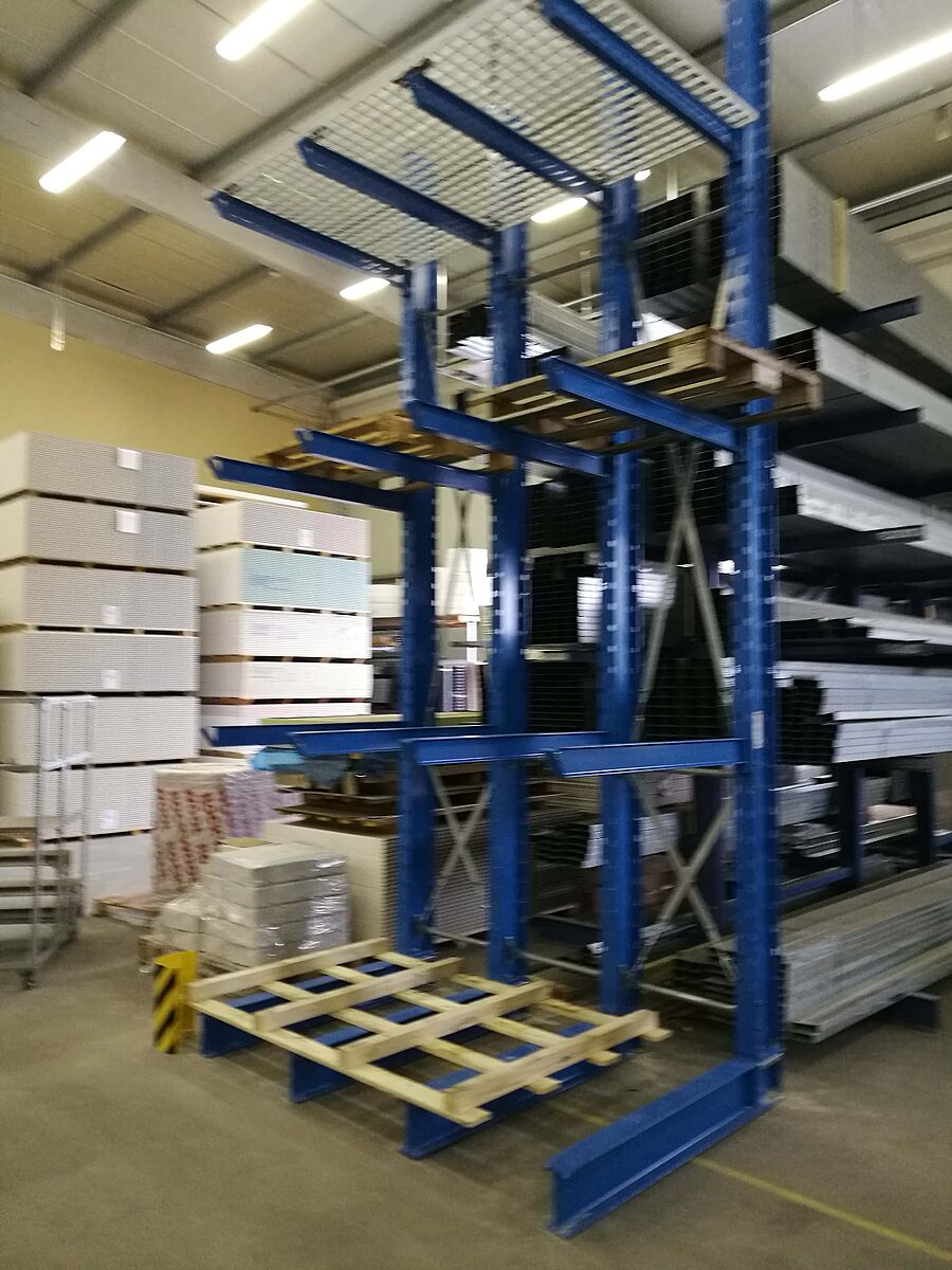 Para armazenamento com economia de espaço de mercadorias longas - por exemplo, perfis de construção seca - a Lambda também montou no exterior vários sistemas de estantes cantilever galvanizados da OHRA. A altura da estante de 4.240 ou 4.840 milímetros também oferece neste caso uma boa utilização da área de base disponível.