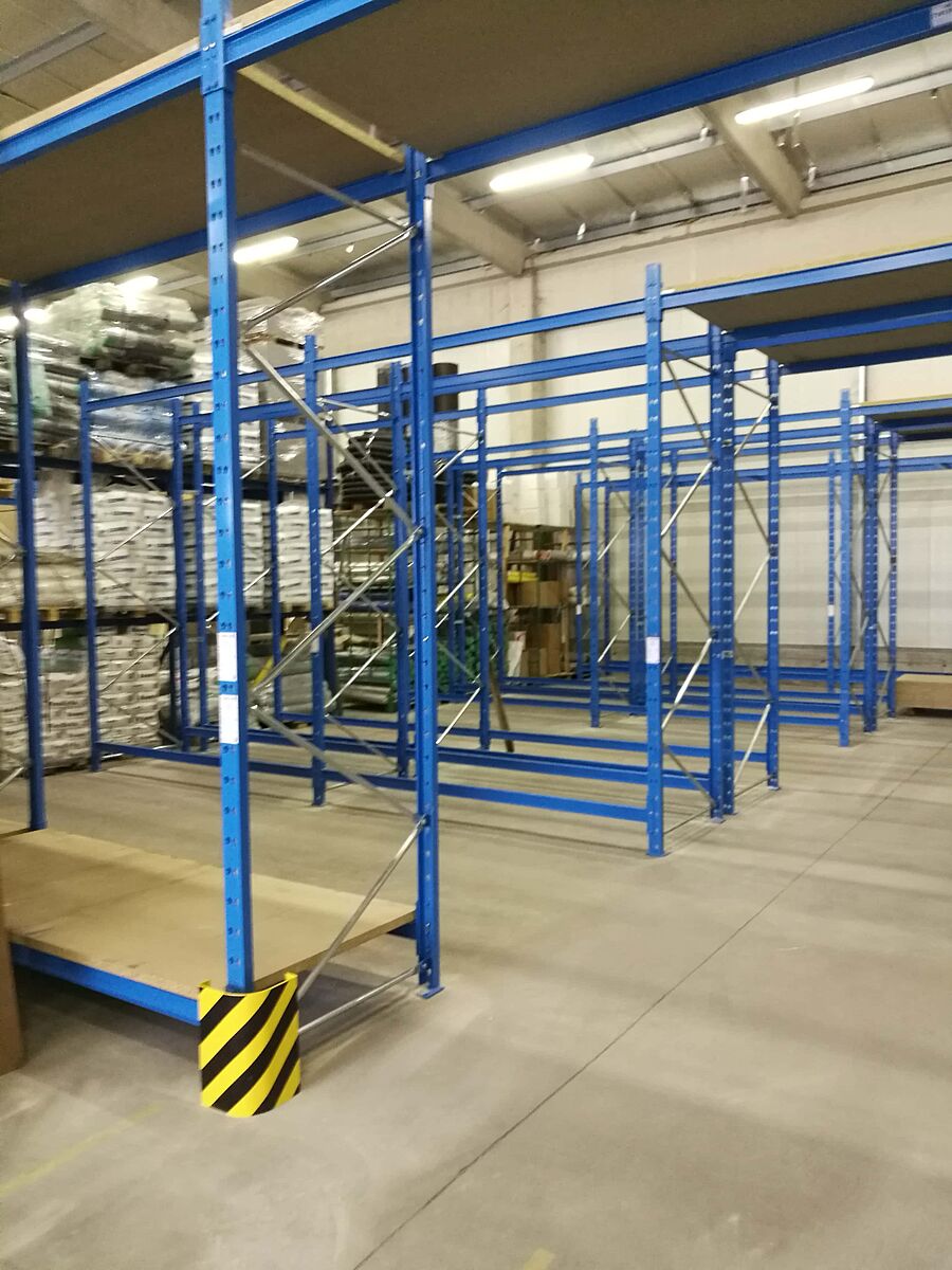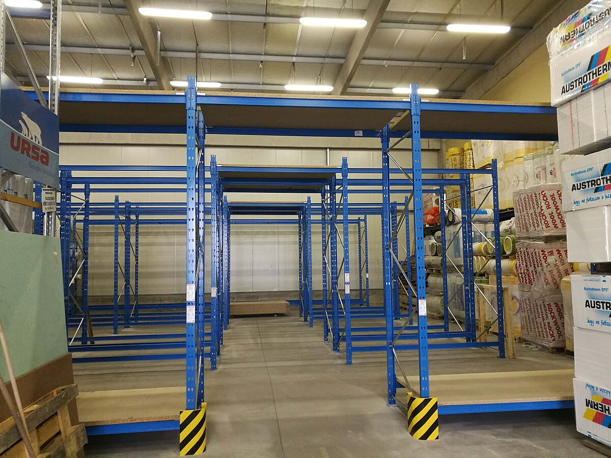 Com as estantes de paletes OHRA adaptadas individualmente foi possível criar um segundo nível de armazenamento: Cinco séries de estantes, cada uma medindo entre 10,6 e 12 metros de comprimento e com uma altura de 3.580 milímetros - que também corresponde à altura do armazém - fornecem espaço para materiais isolantes, como pedra e lã de vidro. Com estas estantes, a área de armazenamento atual foi expandida em altura quase até ao teto. Corredores com 2,2 metros de largura permitem acesso rápido a todas as estantes. As três séries de estantes para paletes adicionais disponibilizam espaço adicional para produtos em paletes.