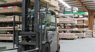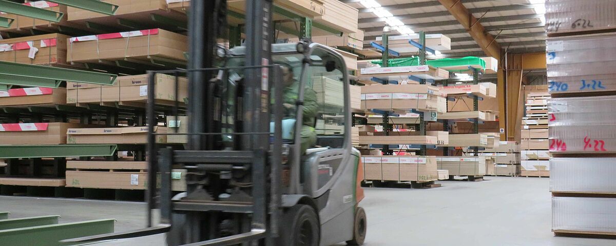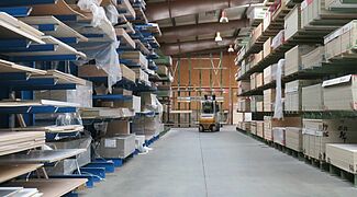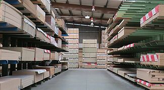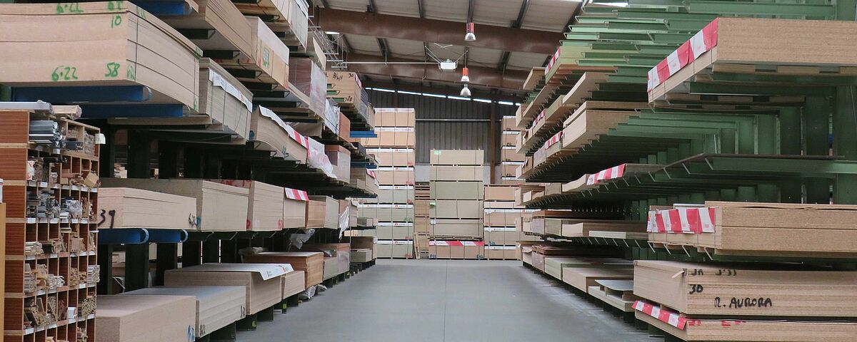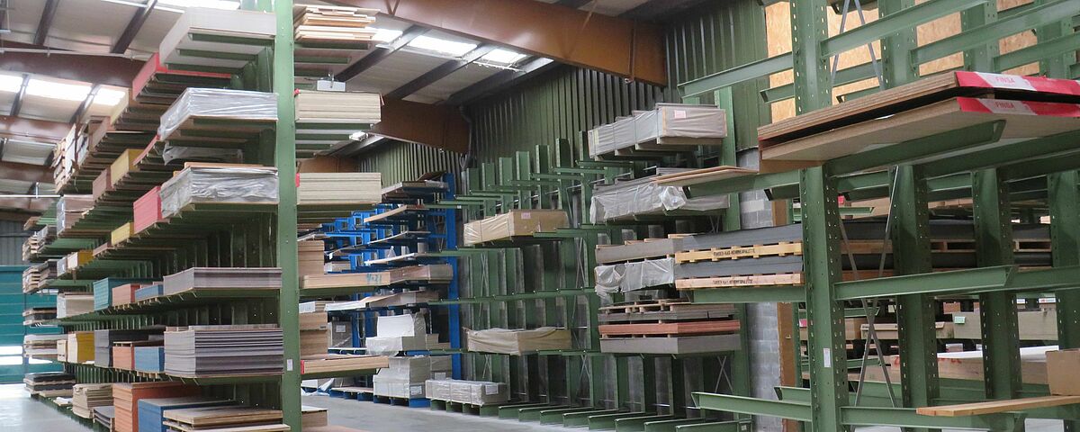 A OHRA instalou diversos sistemas de estantes na zona de armazém: estantes cantiléver, com braços com 1300 mm de comprimento e uma capacidade de carga de 750 quilogramas, com a primeira superfície de armazenamento a 5 metros de altura. São armazenadas sobretudo placas com um elevado volume de vendas e cuja retirada de armazém é rápida. Considerando que foi necessário colocar na zona de armazenamento das placas de LAP muitos outros artigos distintos, colocados em placas com 3050 x 1300 milímetros, foi montada uma estante porta-palete: Com um comprimento de aproximadamente dez metros e uma altura de 6 metros, dispõe de 15 níveis de armazenamento. Tudo isto resulta numa série de compartimentos de armazenamento por estante que permitem um armazenamento classificado, por formato, e consequente acesso rápido.