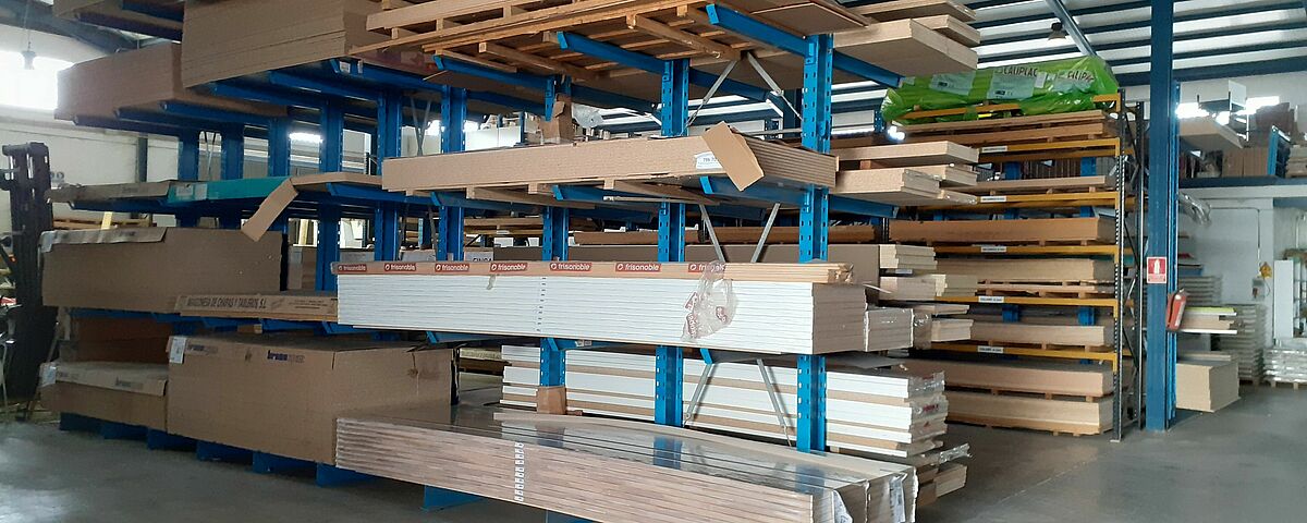 Através de estantes adaptadas individualmente às condições espaciais, a OHRA consegui oferecer ao revendedor espanhol de madeira e ferragens Maderas Fanega uma capacidade de armazenamento 33 por cento maior, com a mesma área de armazenamento. O núcleo do novo sistema é composto por uma fila de estantes com cantilevers de 1200 milímetros de um lado e cantilevers de 1850 milímetros do outro. Esta "assimetria" torna possível fazer o melhor uso possível do espaço no pavilhão já existente, mantendo ao mesmo tempo a largura do corredor necessária para os empilhadores.