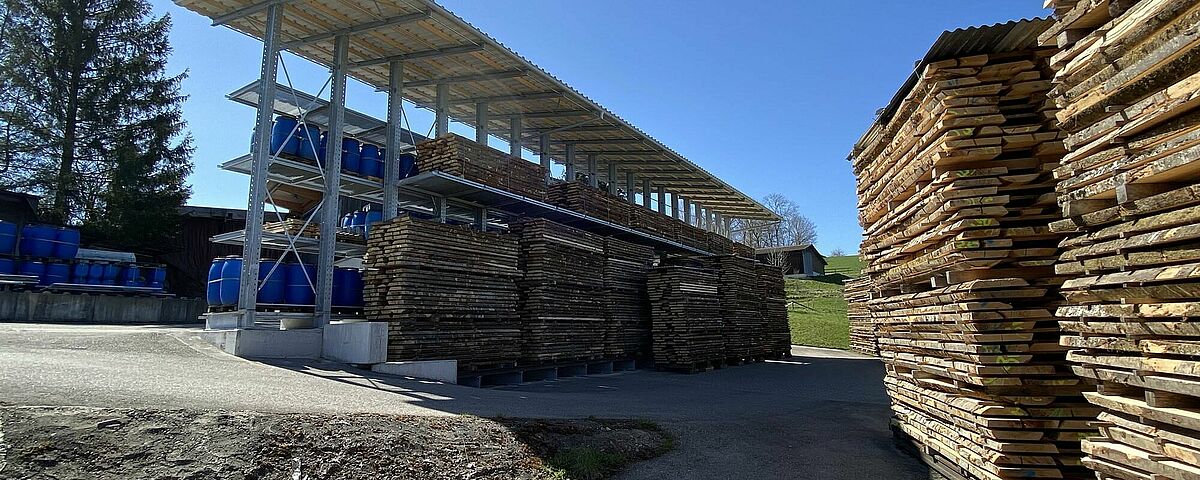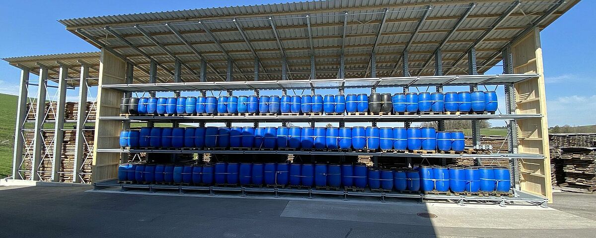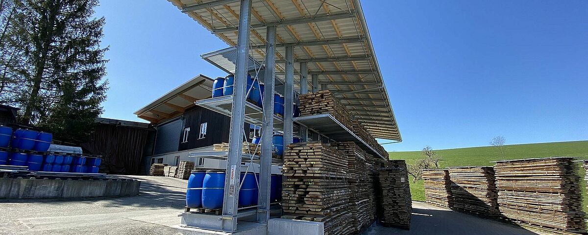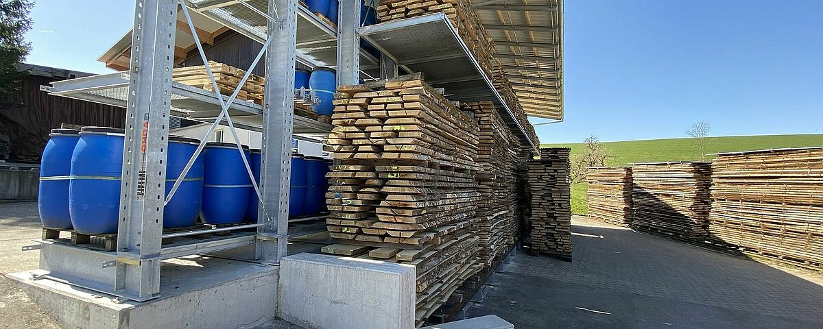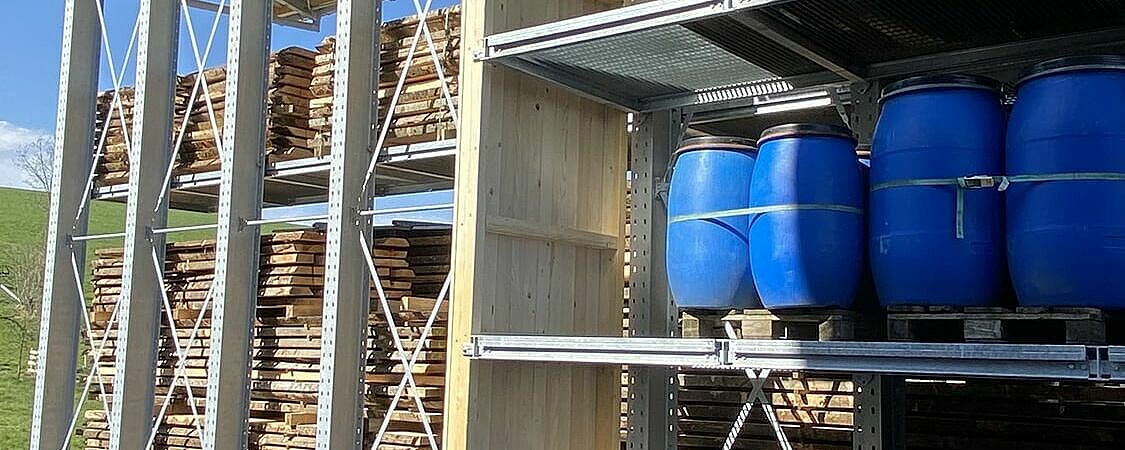 Até agora, a Nyfeler armazenava os blocos de faia, que a carpintaria utiliza para a produção do sistema de pistas de esferas CUBORO, entre outras coisas, bem como lenha e outros artigos, empilhados ao ar livre. No entanto, as paletes Euro utilizadas para este fim estavam constantemente a ficar desgastadas, resultando em pilhas perigosamente tortas. A fim de chegar à mercadoria, os artigos também tinham de ser recolocados de uma forma incómoda. Para os proteger do tempo, a Nyfeler ainda cobriu cada pilha com lonas - o que significou um grande esforço extra no manuseamento. Por último, mas não menos importante, o armazém ocupava uma área excessivamente grande.