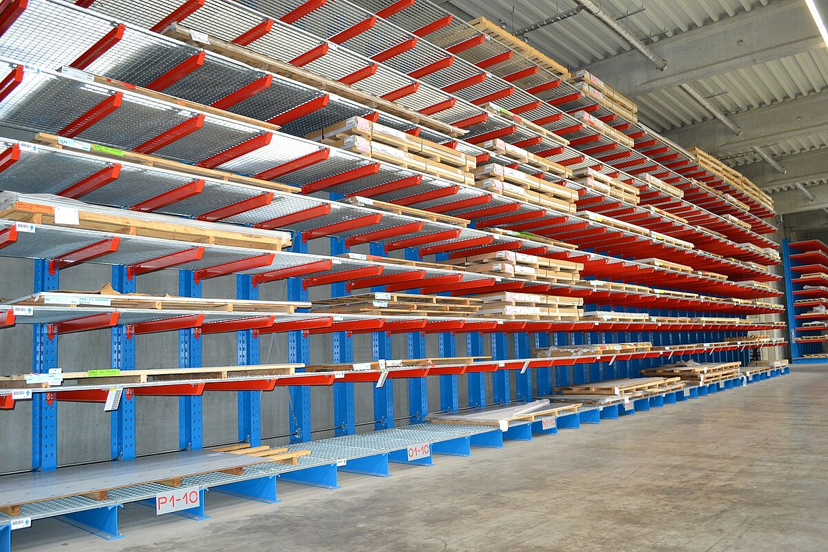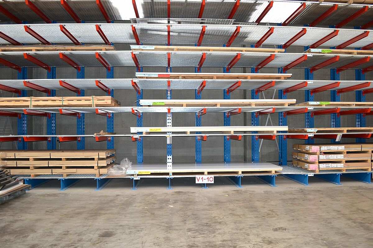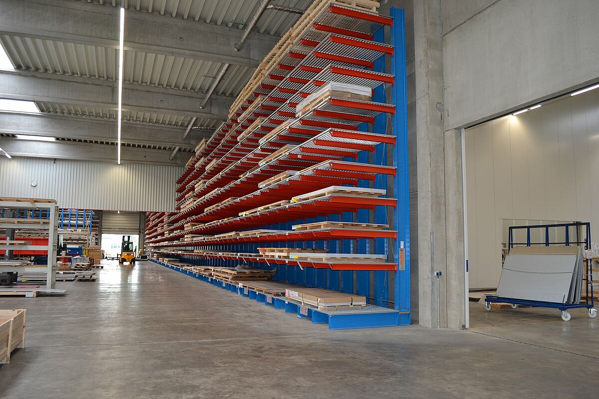 Para obter rapidamente acesso às chapas de 1.000 x 2.000 a 2.000 x 6.000 mm na nova produção, a Ronge Profil decidiu instalar estantes cantilever da OHRA. Elas diferem do padrão pelo uso de perfis de aço sólidos para todos os elementos de suporte de carga. Essa é a base para a alta capacidade de carga e o design fino das estantes, resultando num armazenamento compacto num espaço reduzido.