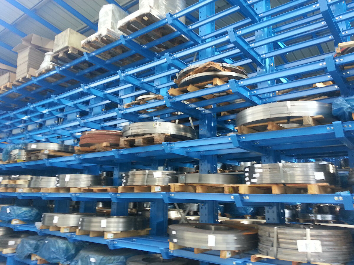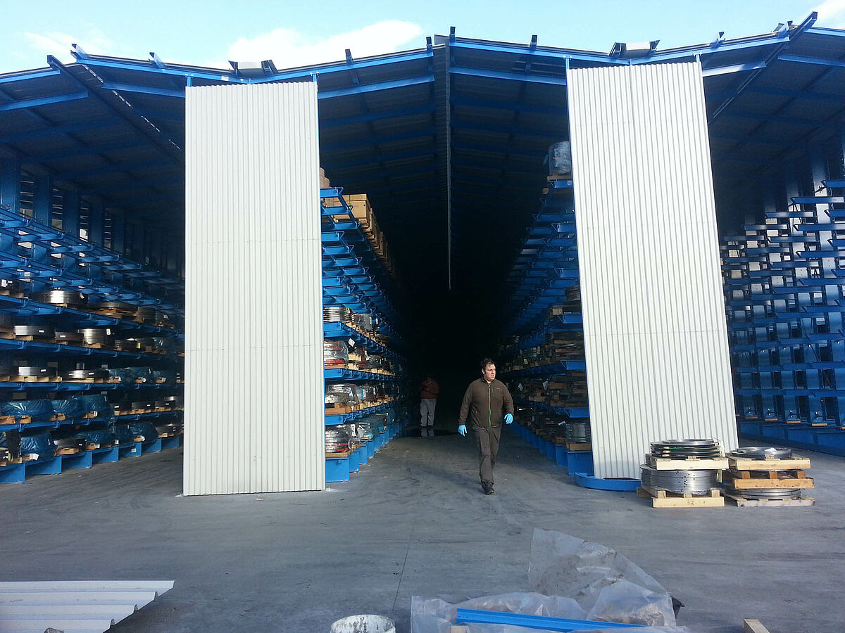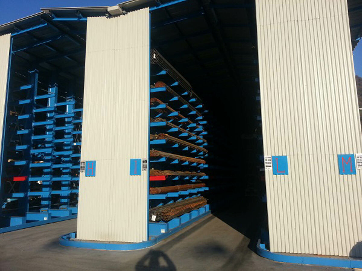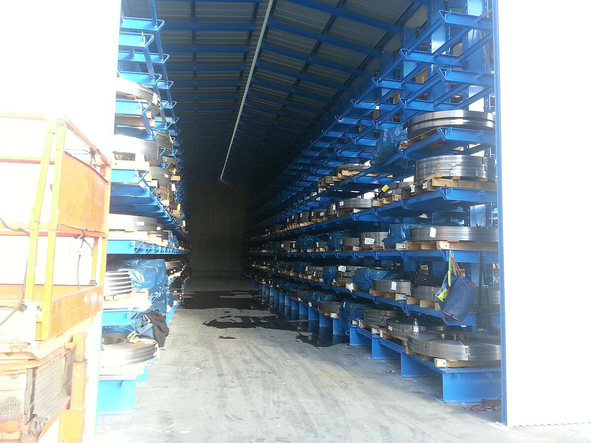 Nas três primeiras linhas de estantes é armazenado o material em barras enfardado com 6.500 milímetros de comprimento e 4.000 quilogramas a dupla profundidade em nove níveis. Os braços portadores das estantes são enganchados e através de parafusos podem ser nivelados milimetricamente, de maneira a garantir o armazenamento uniforme da mercadoria. Estes corredores são operados por uma empilhadeira de quatro vias que é conduzida pelos carris incorporados nas colunas. As restantes linhas da estante estão equipadas com braços ponte e assim oferecem uma superfície continua de armazenamento sobre sete níveis. Aqui são armazenadas em paletes as bobinas de chapa de até 1.200 quilogramas. Estes corredores são operados por uma empilhadeira.