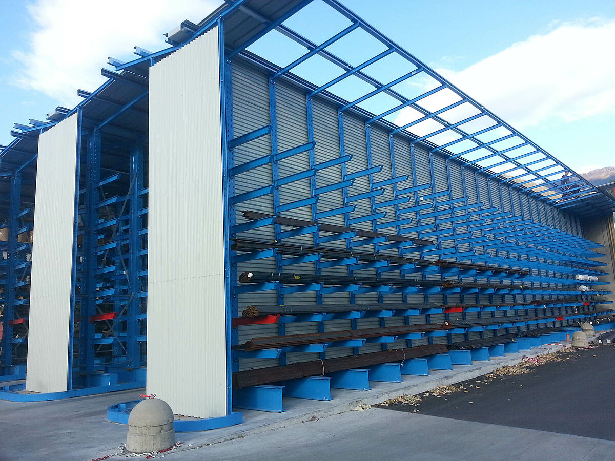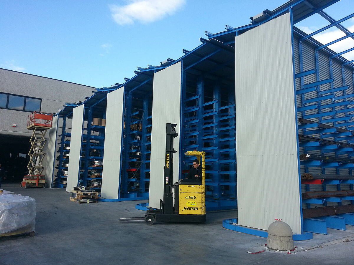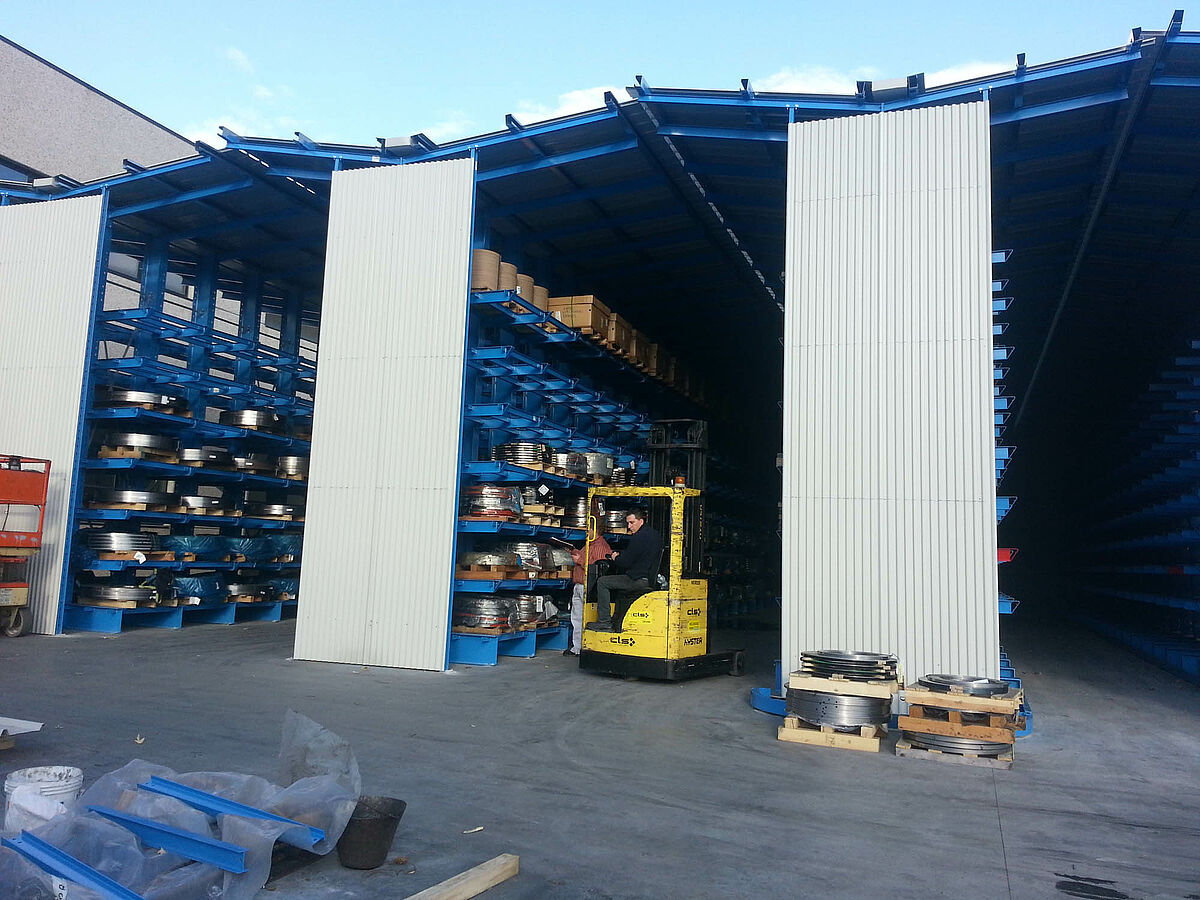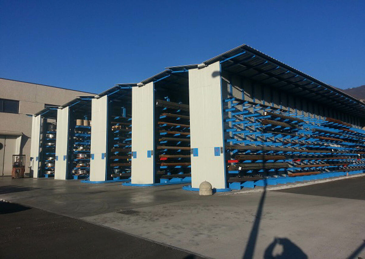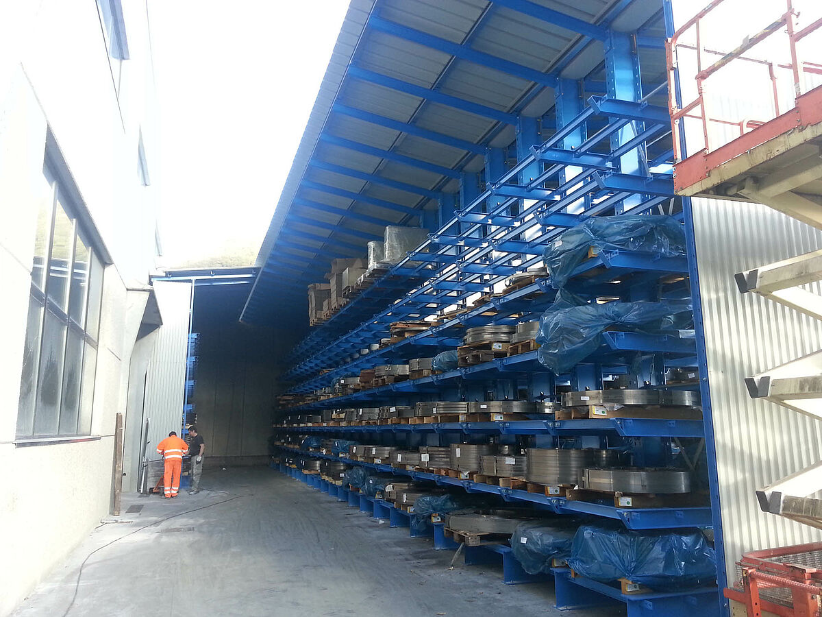 A empresa Rosa Catene na sua sede em Calolziocorte produz correntes para aplicações na agricultura, na indústria e no comércio. O crescimento contínuo da empresa exigiu a construção de um novo armazém para matérias primas para bobinas de chapas em paletes e barras de aço em fardos. A OHRA foi contratada para construir o armazém: A empresa especialista em sistemas de estantes com braços portadores sediada em Kerpen, Alemanha, convenceu a Rosa Catene com um conceito no qual as colunas das estantes com braços portadores servem simultaneamente como construção de suporte para o armazém. No conceito proposto os elementos do teto das seis linhas de estantes sobrepõem-se uns com outros. Dessa maneira resulta um armazém modular completamente coberto que pode ser ampliado sem problemas futuramente. Além disso, esta construção oferece uma clara vantagem de custo e é instalada mais rapidamente que um armazém comum.