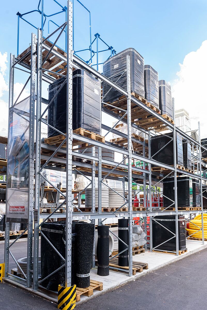 A empresa optou por uma combinação de estantes com apoios extensíveis e estantes paletizadas: Esta opção mista permite armazenar com grande flexibilidade os mais variados artigos. As estantes foram rigorosamente adaptadas aos requisitos da variedade de produtos. Por exemplo as estantes com apoio extensível com 7510 milímetros de altura, dispostas em cinco níveis de armazenamento, permitem a sobreposição de três paletes de material insonorizante. A mercadoria pesada é armazenada sem quaisquer problemas nas estantes paletizadas, com uma capacidade de carga de 4500 kg, disposta em Euro paletes.