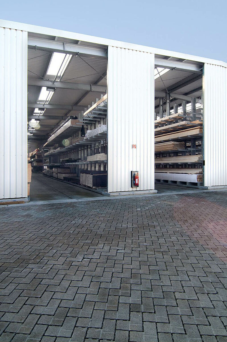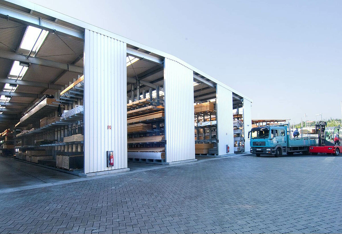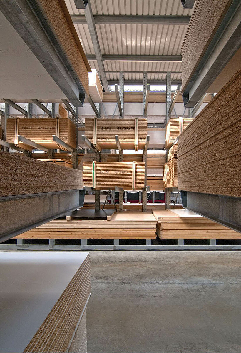 A empresa Schyns sediada em Siegburg oferece como empresa grossista e comércio a retalho um amplo sortido em madeiras para clientes privados e comerciais, desde madeira para a construção até para o jardim. Os artigos de madeira são armazenados em um depósito com estantes que vem sendo ampliado constantemente há mais de 20 anos. Assim com o passar dos anos as fileiras de estantes individuais transformaram-se um uma planta completa, que por sua vez mais tarde foi duplicada. Dessa forma todo o depósito pôde crescer junto com a empresa.