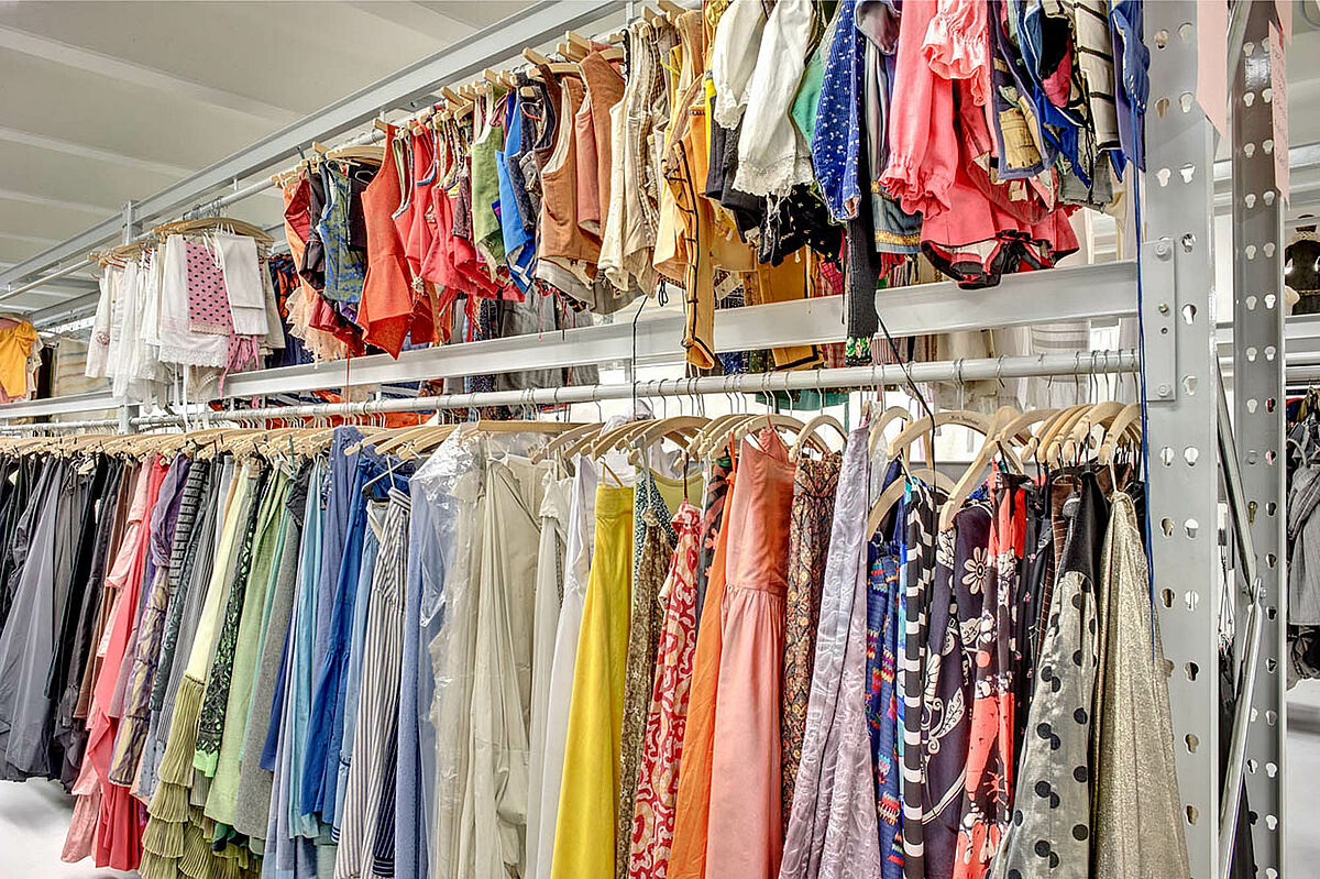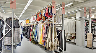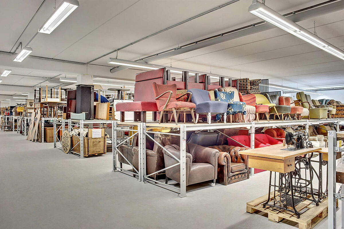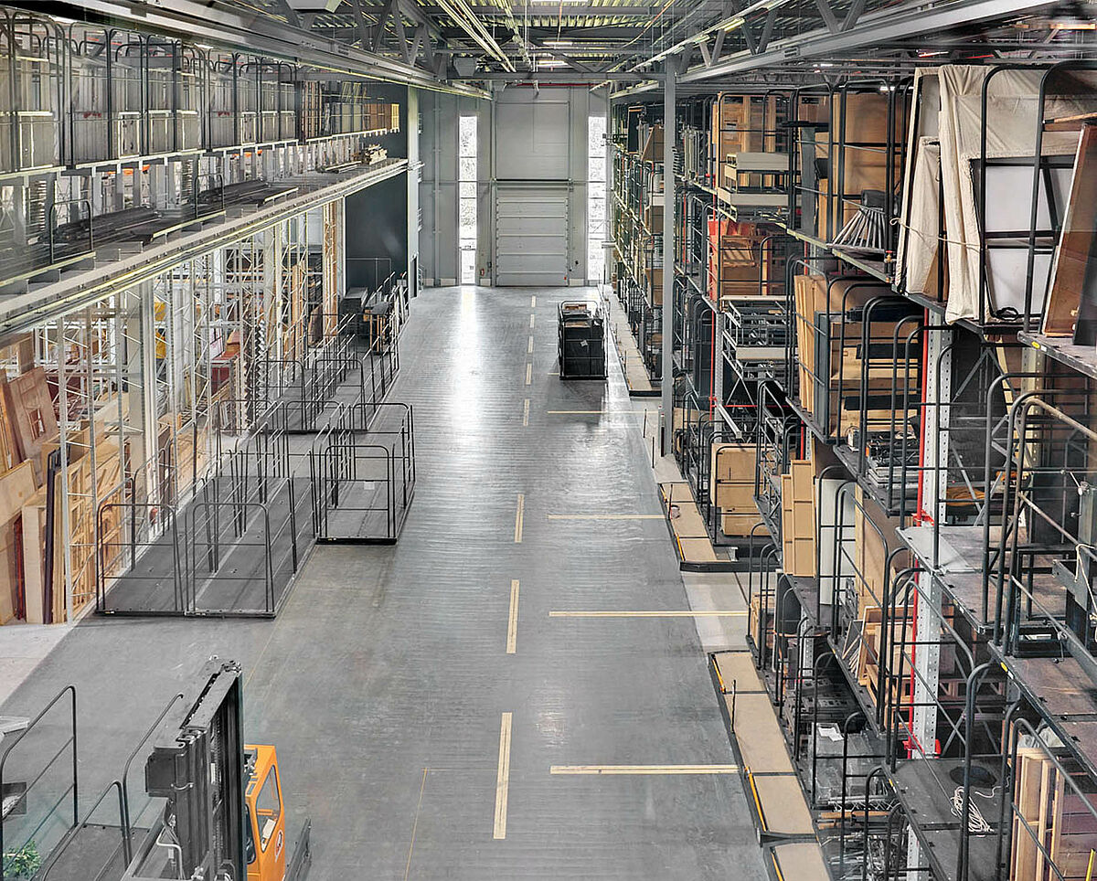 Ao lado, em um depósito com três andares, pode-se encontrar todos os itens necessários para montagem de cenários, tais como mobiliário, luminárias, artigos de decoração, e assim por diante. Um andar inteiro é destinado para roupas, sapatos e acessórios. Não é de se admirar, já que apenas os figurinos ocupam juntos cerca de 2.400 metros no comprimento do armazém. Além disso, existem as prateleiras para sapatos, chapéus e outras peças.