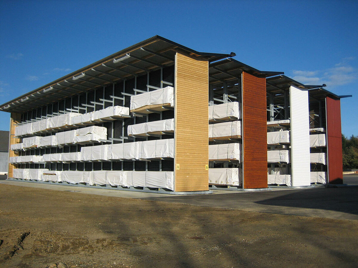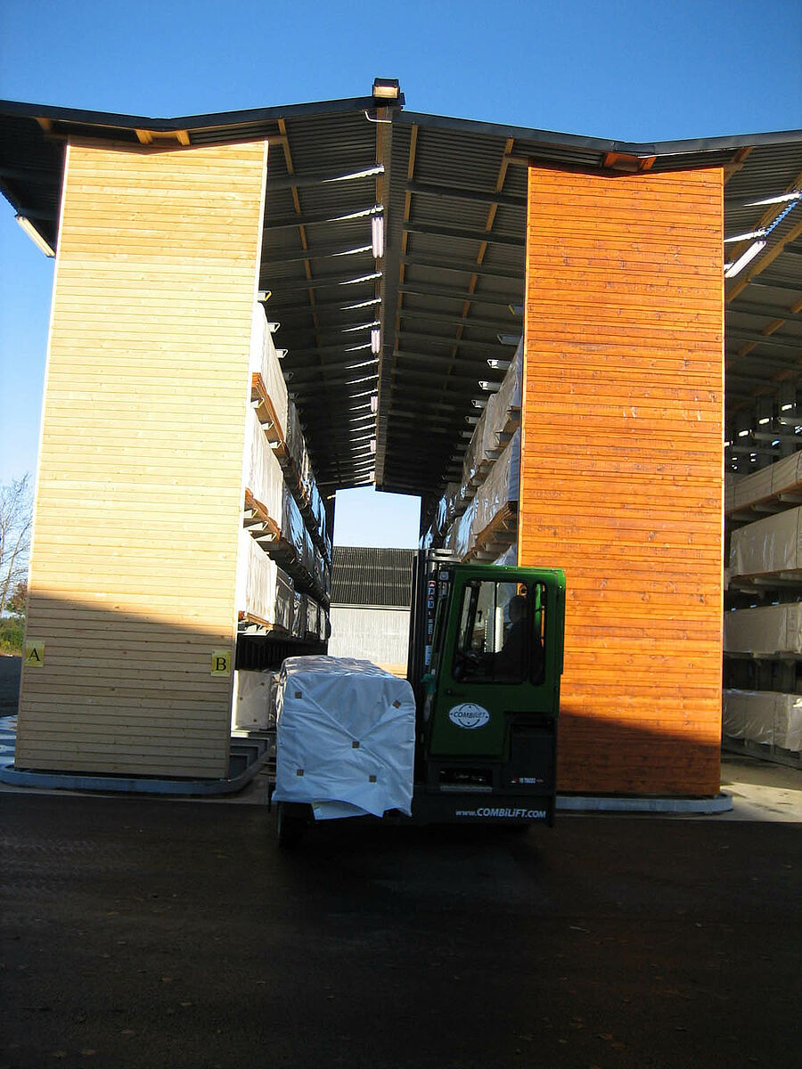 Anteriormente, os pacotes de madeira eram despejados em um pátio aberto. Um grande espaço era necessário para isso, e lidar com a madeira nessas condições era bastante demorado. O cliente, portanto, desejava uma solução de armazenamento localizado nas imediações da sua área de produção. Ao mesmo tempo, a nova unidade deveria ser construída no menor espaço possível, a fim de economizar nos custos com piso de concreto e telhado. Além disso, a possibilidade de uma futura expansão sem necessidade de reconstrução daquele armazém deveria ser considerada. .
