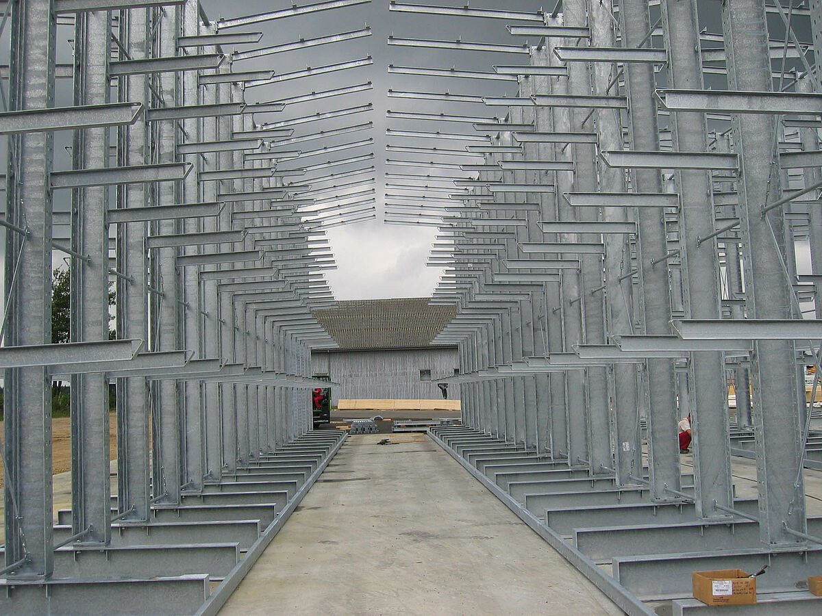 Entre várias opções, Superwood escolheu um sistema de estantes Cantilever por imersão a quente disponibilizada pela OHRA. O cliente ficou particularmente impressionado com os elementos sobrepostos no telhado combinados com um canal estreito que levava até um carregador lateral. Os planos foram feitos em conjunto com um parceiro comercial dinamarquês. Aqui, os pontos importantes, tais como, tipos de concreto, espessura do alicerce e tipos de telhados foram discutidas antes do trabalho começar. Os corredores foram equipados com trilhos de orientação para se adequarem as exigências dos carregadores laterais, e as áreas de entrada em ambos os lados dos corredores foram protegidas do vento e da água com quadros de exibição. Os fundamentos do telhado protegem contra efeitos climáticos diretos e, ao mesmo tempo, providenciam ventilação adequada. Os sistemas externos de estantes foram cobertos com uma pilha de chapas que também serve como um toldo.