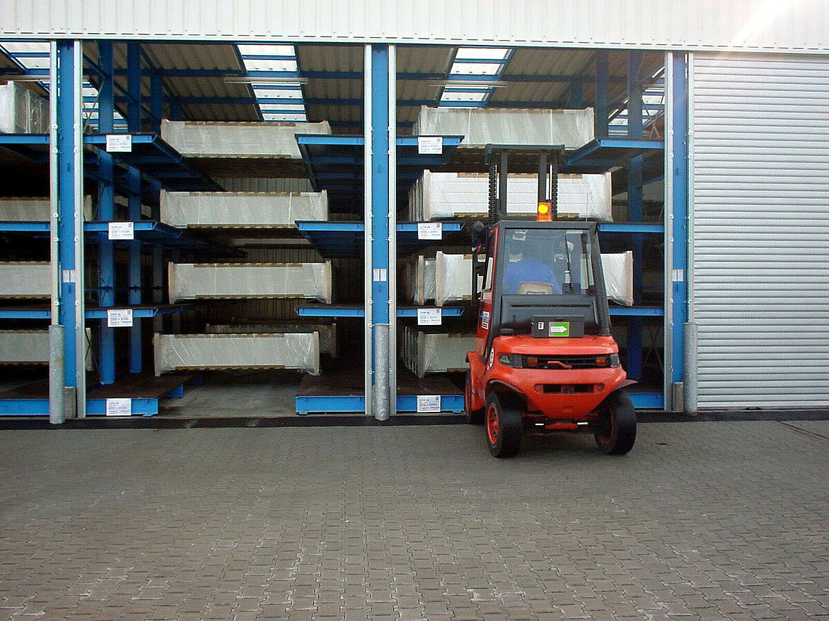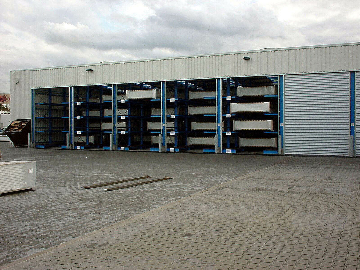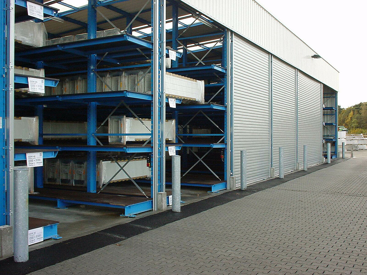 Devido ao grande sucesso de vendas, a ampliação do armazém para produtos acabados tornou-se indispensável, considerando as necessidades específicas de armazenamento de pequenas linhas. Depois de algumas reuniões com o cliente em questão, um novo tipo de sistema de estantes Cantilever drive-in foi concebido, o que permiteu armazenar portas com uma largura de 4,2m até 6,5 m.