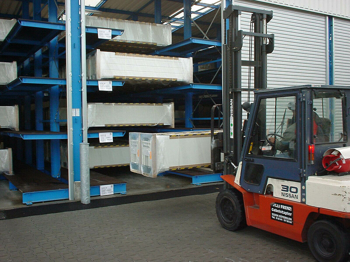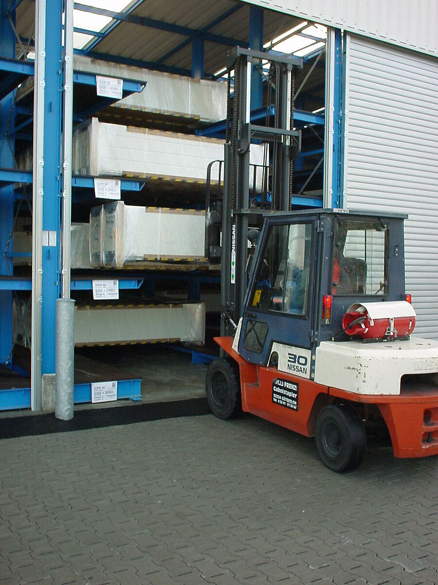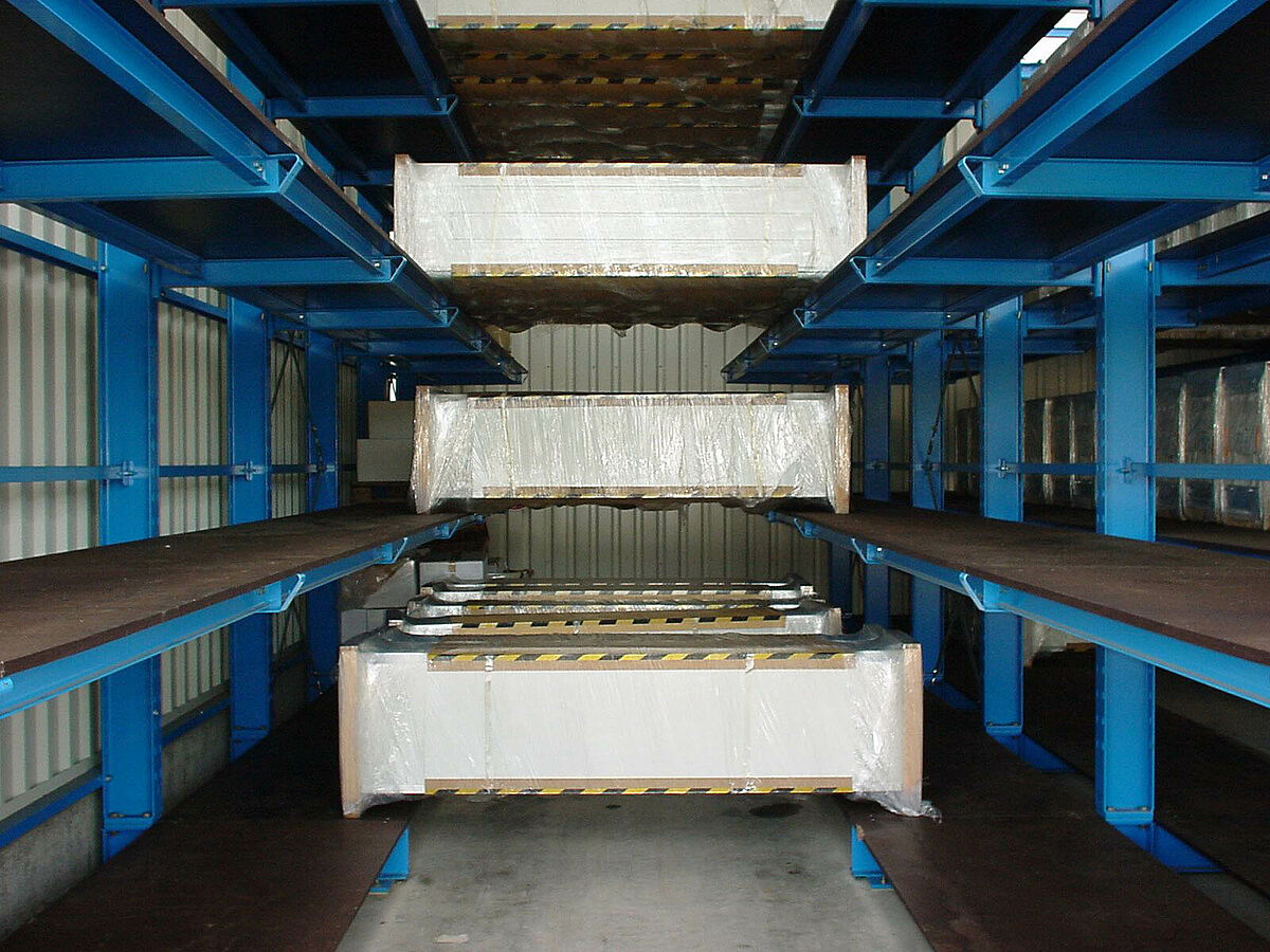 Devido ao grande sucesso de vendas, a ampliação do armazém para produtos acabados tornou-se indispensável, considerando as necessidades específicas de armazenamento de pequenas linhas. Depois de algumas reuniões com o cliente em questão, um novo tipo de sistema de estantes Cantilever drive-in foi concebido, o que permiteu armazenar portas com uma largura de 4,2m até 6,5 m.