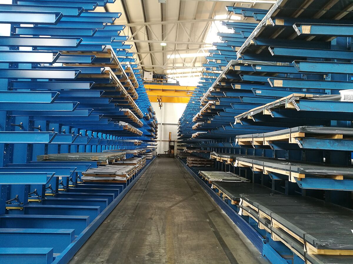 A thyssenkrupp escolheu as estantes cantilever de quatro estantes de braços móveis da OHRA: Nestas, os braços são móveis e poderão recuar com o impacto - prevenindo assim danos na mercadoria e na própria estante, minimizando a necessidade de reparação. Além disso, as estantes OHRA oferecem uma elevada capacidade de carga, graças à sua estrutura em perfis de aço fundidos compactos. As estantes com 6 metros de altura instaladas na thyssenkrupp Materiais têm mais de dez superfícies de armazenamento. Cada um dos braços móveis com 1500 mm de comprimento suporta uma carga de até 1400 kg. Os trilhos na base permitem a utilização de um empilhador - para que toda a área de utilização do armazém seja otimizada e a capacidade de armazenamento significativamente maior.
