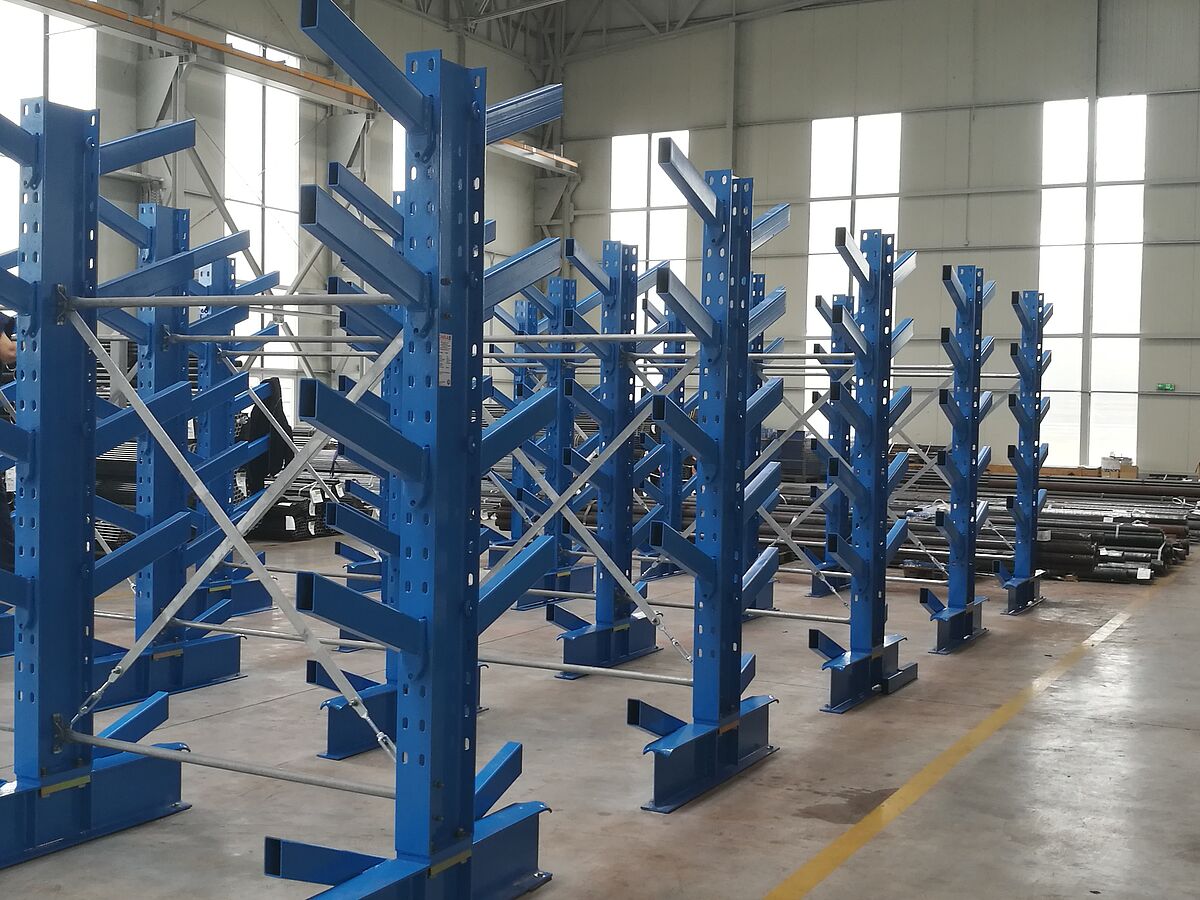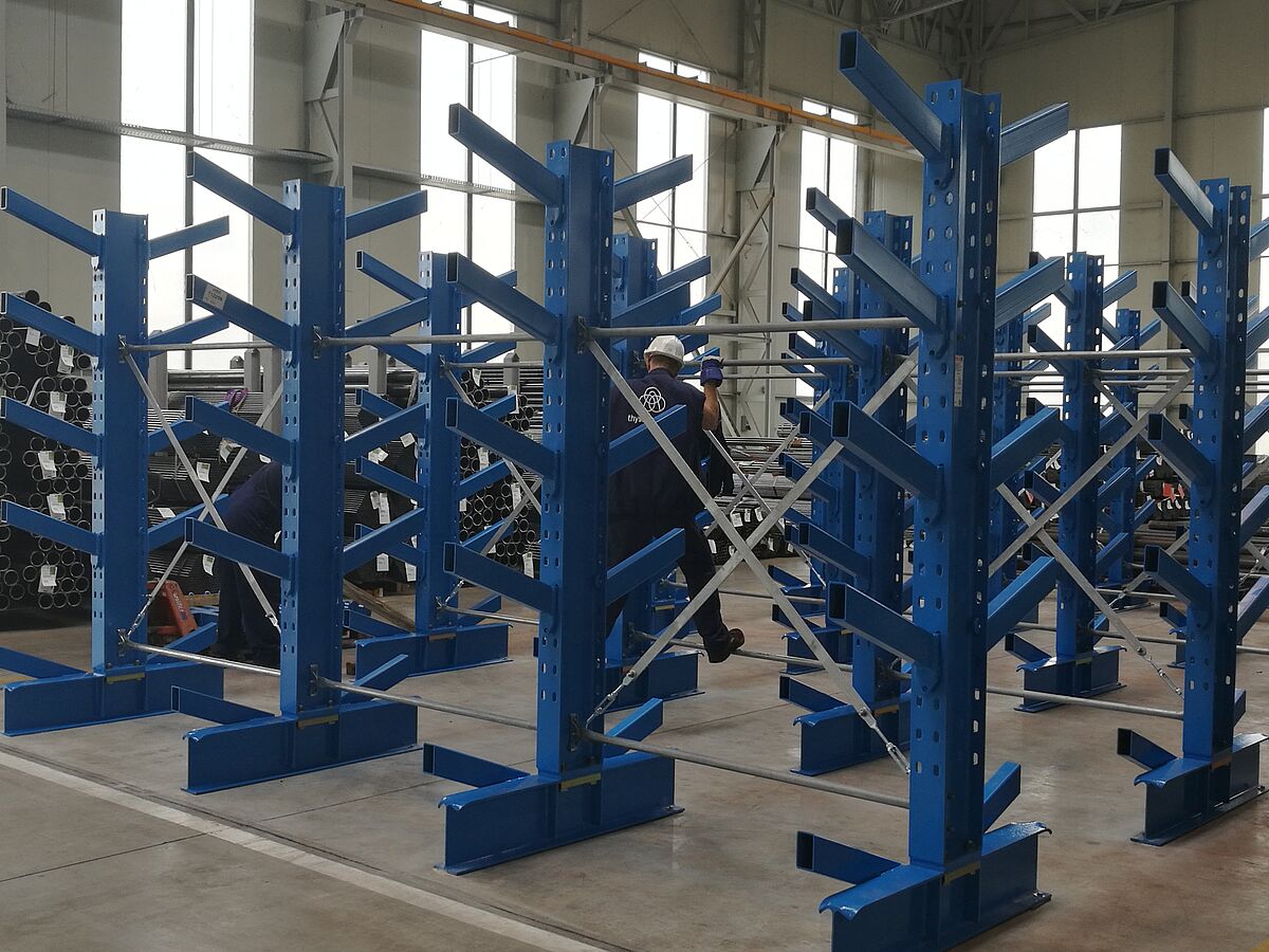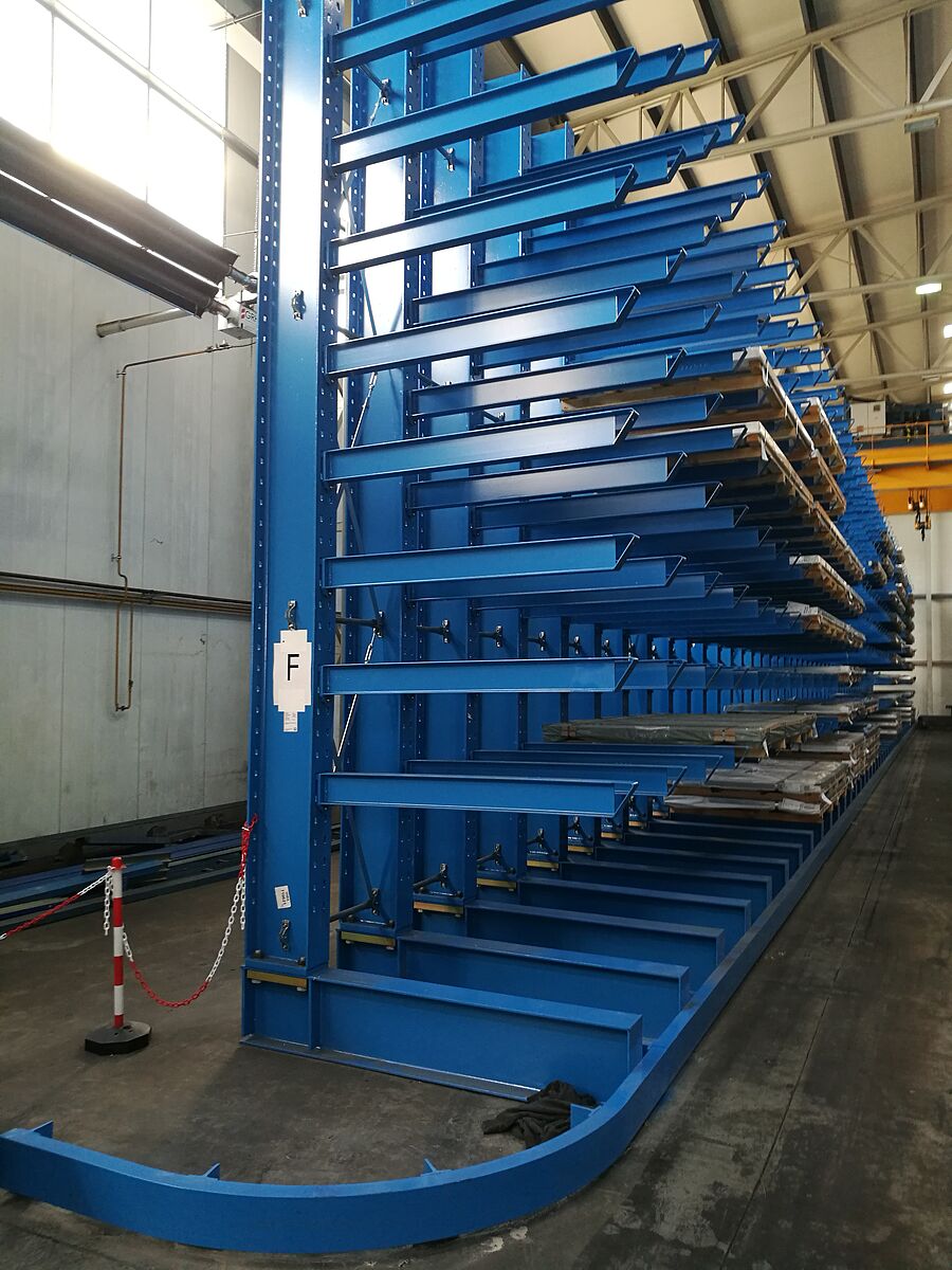 A OHRA instalou sete linhas de estantes de braços inclinados. Aqui poderão ser armazenados tubos, perfis e barras, por guindaste. Neste tipo de estantes, os braços inclinados são acabados com 20º de inclinação. A palete de mercadorias longas desliza para o compartimento designado, sendo o armazenamento com o guindaste consideravelmente simplificado. Também nas estantes de braços inclinados, os braços são móveis. As estantes montadas na thyssenkrupp Materials têm 2.5 metros de altura e permitem o armazenamento de mercadorias planas até 6000 milímetros de comprimento. A capacidade de sustentação de carga dos braços de 500 milímetros é de 800 kg.