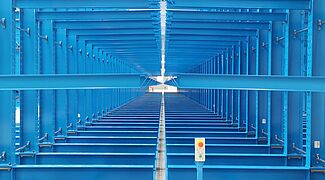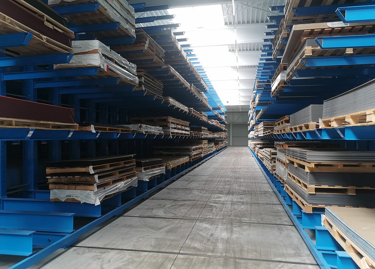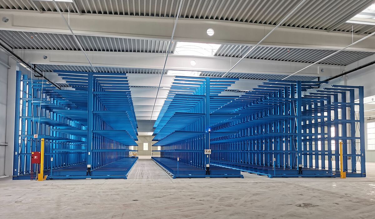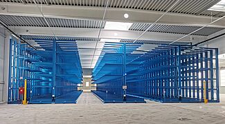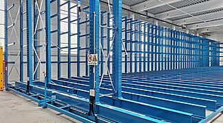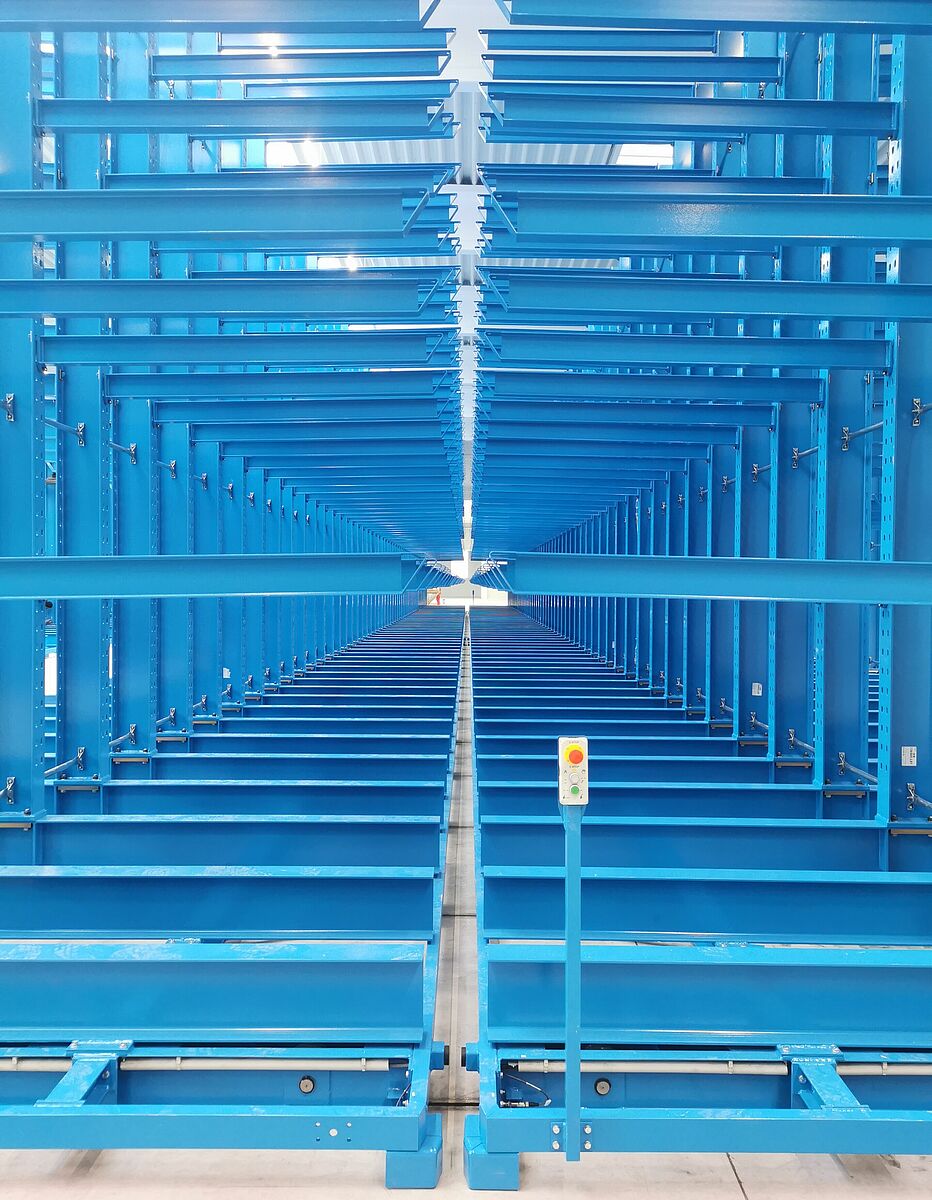 Composto por três estantes cantilever de um lado fixadas ao chão, bem como três estantes de dois lados montadas em carretos móveis. Ao mover os carrinhos para formar um bloco de armazenamento compacto, apenas um corredor de estantes está aberto de cada vez para operação com um empilhador de quatro vias - portanto, a utilização do espaço é muito elevada. As estantes móveis têm, cada uma, pouco menos de 50 metros de comprimento e 6,5 metros de altura. Os braços com 2,1 metros de comprimento formam cinco níveis de armazenamento, cada um transportando uma carga de até 800 quilos. No total, cada chassis é assim carregado com um máximo de 528 toneladas. Apesar desta carga, os carretos móveis movem-se a uma velocidade de aprox. 4 metros por minuto - deste modo não é preciso esperar muito para que o corredor de serviço com 4,59 metros de largura se abra.