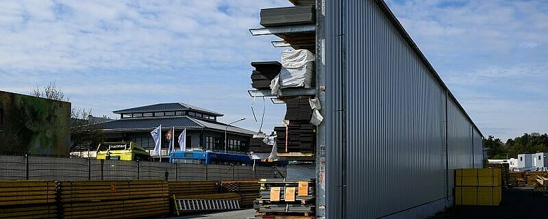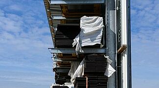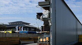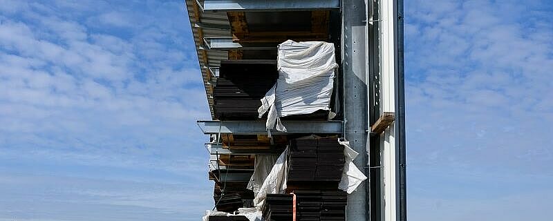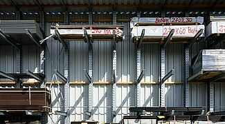 Um teto integrado com dois metros de profundidade e a parede traseira revestida com chapa trapezoidal protegem os painéis de contraplacado armazenados das intempéries. Um dos desafios foi o facto de as placas terem dimensões entre 3,3 por 2,4 e 0,6 por 0,3 metros. Para evitar que os painéis se dobrem durante o armazenamento, a OHRA ajustou o espaçamento entre os montantes e variou-o dentro das estantes: Entre 26 montantes é de 1000 milímetros, entre os restantes 27 montantes é de 1200 milímetros. Assim, todos os formatos podem ser armazenados com segurança e o espaço pode ser bem aproveitado.
