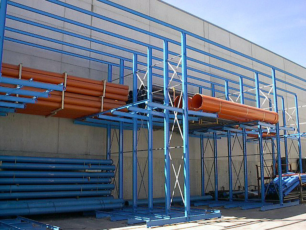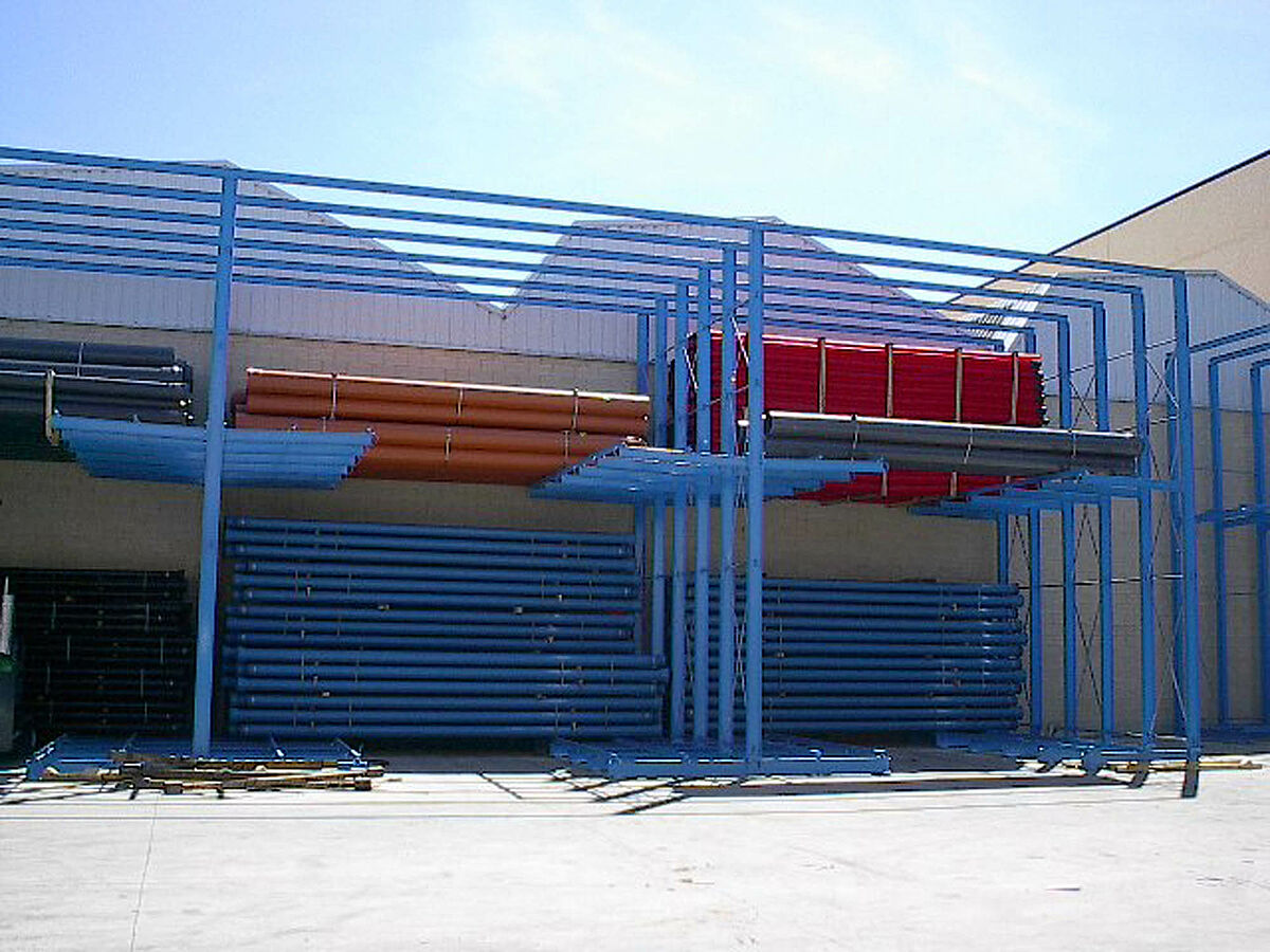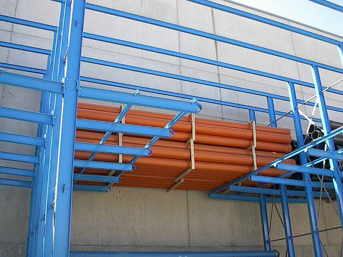 Como complemento para o sistema drive-in, OHRA também providenciou sólidas estantes Cantilever. Aqui, diversos produtos são armazenados a partir dos menos requisitados. Os feixes de tubo são guardados em várias camadas sobrepostas. Graças ao comprimento da estante Cantilever de até 2.500 mm, o cliente também pôde armazenar 2 pacotes de tubos consecutivos em uma área plana..