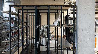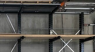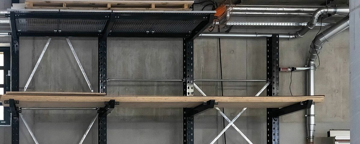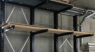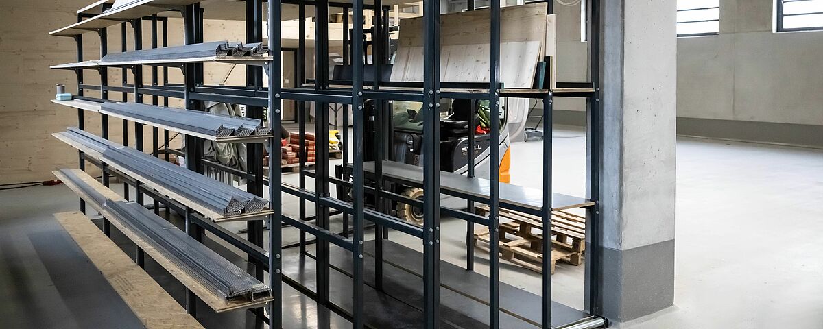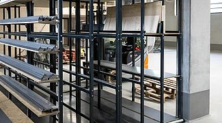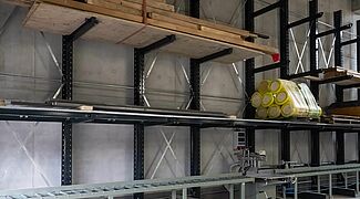 O sistema de estantes concebido para o novo armazém é composto por um sistema de estantes cantilever galvanizado a quente com quase 16 metros de comprimento para a área exterior. Na zona interior foi instalado um sistema de estantes cantilever de 15 metros de comprimento e outro de três metros. As estantes cantilever com cerca de sete metros de altura oferecem uma capacidade de armazenamento consideravelmente maior em comparação com o armazenamento no solo e as estantes cantilever significativamente mais baixas utilizadas no antigo espaço. Os braços das estantes cantilever, que podem transportar até 1000 kg, foram também parcialmente equipados com grades metálicas e pontes de braço. O que permite armazenar nas estantes uma grande variedade de tipos de madeira, artigos de consignação e formatos de paletes. A somar a tudo isto, graças aos braços cantilever livremente suspensos, as alturas dos níveis de armazenamento individuais podem ser ajustadas de forma muito flexível. Foram instaladas duas estantes verticais adicionais para armazenar placas de diferentes tamanhos, nas quais as placas são armazenados verticalmente - de modo a que a placa pretendida possa ser acedido de forma rápida e fácil. Todas as estantes interiores foram revestidas a pó num atraente cinzento antracite (RAL 7016) a pedido da "Ihre Zimmerei".