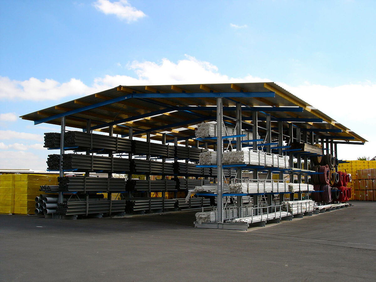 Para o armazenamento exterior, as estantes podem ser individualmente cobertas. A OHRA oferece diferentes estruturas de coberturas. Os armazéns de estantes da OHRA unem na perfeição a funcionalidade do edifício necessária à função de uma instalação de estantes convencional. São assim também mais económicos do que os armazéns convencionais, uma vez que as estruturas das estantes são simultaneamente elementos de sustentação da cobertura e da parede. As construções de edifícios individuais tornam-se assim supérfluas. As variantes individuais de execução possibilitam uma adaptação às suas necessidades de armazenamento. Desde o planeamento, construção, estática, produção, entrega e montagem até ao pedido de construção, tudo numa só mão
