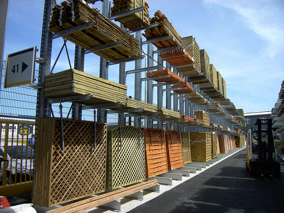 Estantes verticais para ripas e outros produtos longos, estantes de palatização para vários produtos em paletes, até plataformas de armazenamento com revestimento atraente para a área de vendas. Especialmente para armazenamento no exterior, a OHRA oferece sistemas de armazenamento e estantes com telhados. As estantes são galvanizadas a quente protegidas contra corrosão.