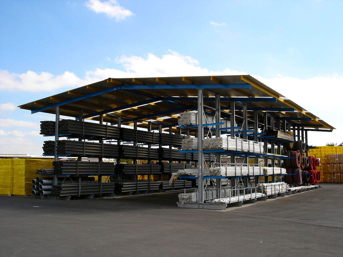 Neste tipo de armazém, as colunas verticais das estantes cantilever são cortadas de forma inclinada, dependendo da forma do telhado, sendo providas de painéis ou elementos de fixação de suporte. Por cima das colunas será montada a armação do telhado. Para o revestimento da parede podem ser colocados painéis canelados, painéis com isolamento sonoro ISO ou sistemas de proteção contra as condições meteorológicas na parte traseira da estante.